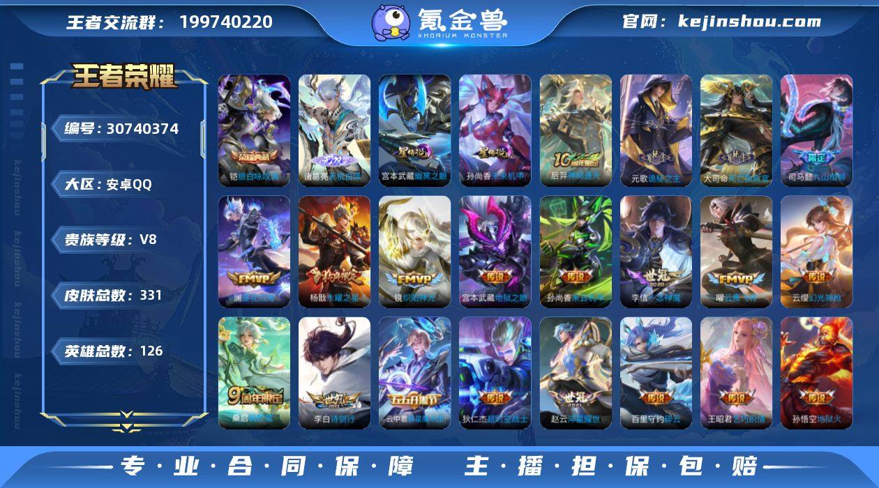 账号亮点:铠银白咏叹调 诸葛亮天机白泽 后羿神树通天,元歌诡秘之主,大司命死亡执政官,司马懿九山相柳,云缨幻光神枪,桑启鸣野蒿,云中君群星魔术团,澜逐花归海,李白诗剑行,百里守约碎云,赵云淬星耀世,王昭君乞巧织情,铠绛天战甲,镜炽阳神光,虞姬启明星使,曜云鹰飞将,李信一念神魔,杨戬永曜之星,孙尚香末日机甲,宫本武藏地狱之眼,孙悟空地狱火,狄仁杰超时空战士700 【英雄全皮】:孙权全皮,戈娅全皮,空空儿全皮 【荣耀典藏】:铠银白咏叹调 【无双皮肤】:诸葛亮天机白泽 【传说皮肤】:后羿神树通天,元歌诡秘之主,大司命死亡执政官,司马懿九山相柳,云缨幻光神枪,桑启鸣野蒿,云中君群星魔术团,澜逐花归海,李白诗剑行,百里守约碎云,赵云淬星耀世,王昭君乞巧织情,铠绛天战甲,镜炽阳神光,虞姬启明星使,曜云鹰飞将,李信一念神魔,杨戬永曜之星,孙尚香末日机甲,宫本武藏地狱之眼,孙悟空地狱火,狄仁杰超时空战士 【限定皮肤】:蔡文姬夏日便利店,大乔绒语心约,虞姬夏日便利店,姜子牙天穹之誓,杨戬破阵退雄兵,狄仁杰阴阳师,赵云皇家上将,墨子降魔,孙尚香蔷薇恋人,庄周高山流水,钟无艳超时空战士,扁鹊奇幻香踪,芈月幻夜卜梦,元歌无心,甄姬落雪兰心,狄仁杰魔术师,狄仁杰万华元夜,达摩星际陆战队,达摩沙漠行僧,项羽海滩派对,程咬金演武夺筹,韩信傲雪梅枪,兰陵王金庭之子,后羿圣弓游侠,李元芳云中旅人,虞姬启明星使,钟馗驱傩正仪,杨戬永曜之星,杨戬潮玩骑兵,干将莫邪真爱魔法,鬼谷子五谷丰年,黄忠火炮绅士,苏烈千军破阵,百里玄策原初追逐者,沈梦溪大漠名商,裴擒虎李小龙,裴擒虎擒涛扼浪,云中君纤云弄巧,上官婉儿梁祝,嫦娥拒霜思,嫦娥暖冬兔眠,西施玲珑珍味,鲁班大师探海日志,桑启海盐诗旅,暃星界游侠,戈娅驭风魔法,艾琳女武神,艾琳...