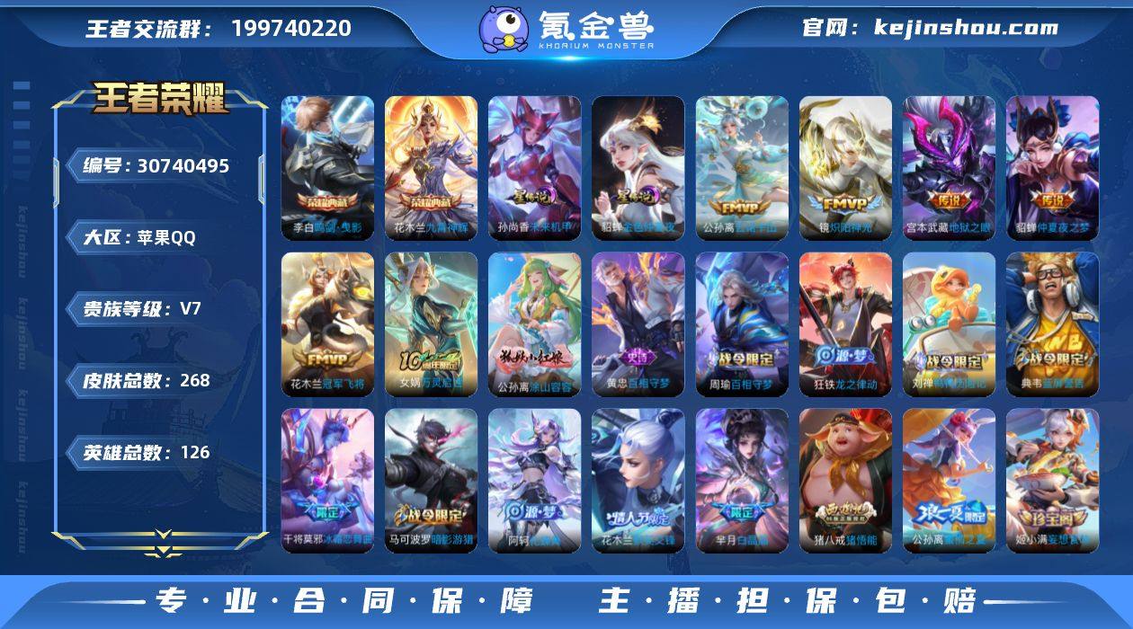 [8626077]金标杨玉环 240皮肤 2典藏 2星传说 4传说 72限定 1按键 游走20段 发育路19段 1银标!实名: 可修改 贵族等级: V7 英雄数: 123 皮肤数: 240 荣耀水晶: 鸣剑·曳影,九霄神辉 星传说: 未来机甲,金色仲夏夜 传说皮: 冠军飞将,炽阳神光,仲夏夜之梦,云诺千山 限定皮: 遇见飞天,李小龙,梁祝,白晶晶,蜜橘之夏,冰霜恋舞曲,一生所爱,默契交锋-花木兰,猪悟能,五谷丰年