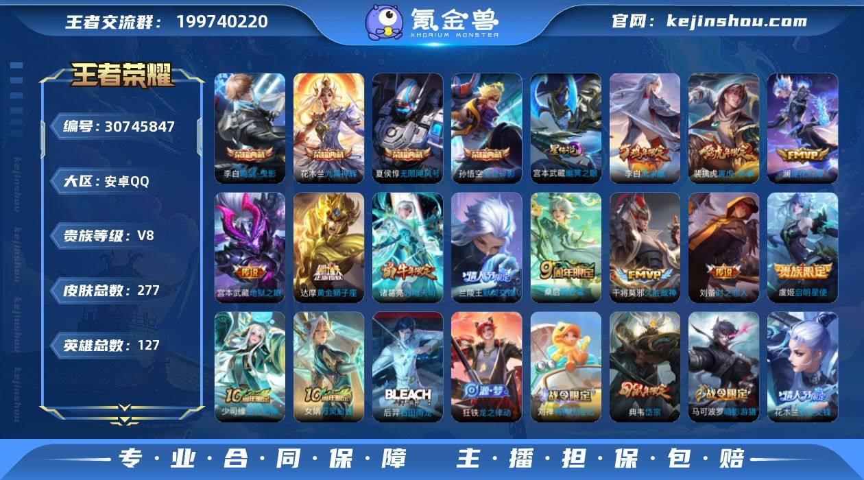 【特价急出/详情看图】安卓Q-V7-永恒钻石V段位-128英雄-314皮肤-2典藏皮肤-1典藏英雄-2星元-11传说-81史诗 【英雄全皮】:孙权全皮,狂铁全皮 【荣耀典藏】:武则天英雄,孙悟空全息碎影,花木兰九霄神辉 【传说皮肤】:后羿神树通天,吕布遇见神鼓,李信山海炽霜斩,孙尚香异界灵契,赵云淬星耀世,曜李逍遥 ,小乔音你心动,达摩黄金狮子座,貂蝉仲夏夜之梦,孙悟空地狱火,武则天海洋之心 【限定皮肤】:狄仁杰阴阳师,虞姬凯尔特女王,赵云皇家上将,墨子神迹守卫,嬴政白昼王子,孙尚香蔷薇恋人,孙尚香异界灵契,鲁班七号狮舞东方,庄周高山流水,高渐离玩趣恶龙,阿轲迷踪丽影,钟无艳超时空战士,芈月幻夜卜梦,吕布猎兽之王,吕布遇见神鼓,周瑜赤莲之焰,元歌无心,夏侯惇朔风刀,甄姬游园惊梦,甄姬落雪兰心,典韦穷奇,典韦蓝屏警告,马可波罗暗影游猎,狄仁杰魔术师,狄仁杰万华元夜,达摩星际陆战队,达摩沙漠行僧,项羽海滩派对,老夫子醍醐杖,老夫子航海奇遇记,程咬金演武夺筹,刘邦夺宝奇兵,王昭君午后时光,兰陵王驯魔猎人,兰陵王金庭之子,牛魔御旌,后羿圣弓游侠,李元芳匿光侦查者,李元芳云中旅人,钟馗神迹守卫,钟馗驱傩正仪,杨玉环遇见飞天,女娲朔望之晖,干将莫邪真爱魔法,雅典娜单词大作战,蔡文姬繁星吟游,太乙真人饕餮,鬼谷子原初探秘者,鬼谷子五谷丰年,大乔白鹤梁神女,黄忠火炮绅士,铠青龙志,苏烈千军破阵,百里守约朱雀志,弈星混沌棋,沈梦溪大漠名商,明世隐疑决卦,裴擒虎李小龙,裴擒虎擒涛扼浪,狂铁御狮,狂铁电玩高手,米莱狄御霄,米莱狄胡桃异想国,云中君纤云弄巧,李信山海炽霜斩,伽罗天狼溯光者,盾山御銮,猪八戒西部大镖客,上官婉儿梁祝,嫦娥拒霜思,嫦娥暖冬兔眠,曜李逍遥 ,蒙犽狂想玩偶喵,鲁班大师探海日志,桑启海盐诗旅,暃星界游侠,张良...