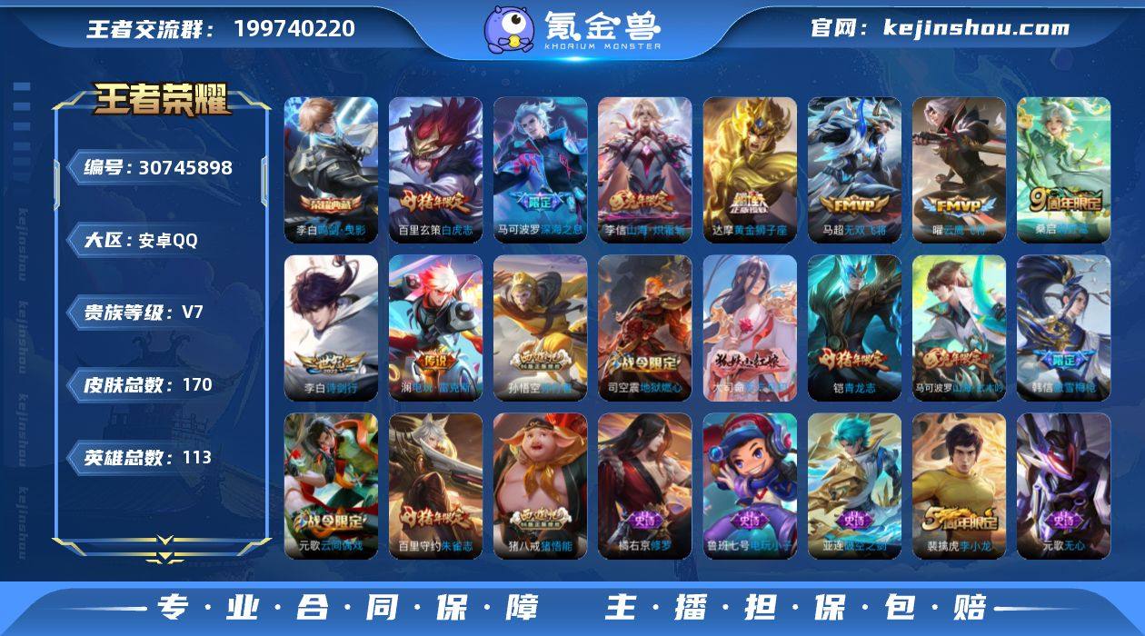 【V7 1典藏 9传说 170皮肤 113英雄】可二次 14印记4荣耀印记 打野37 司马懿金标万战 鸣剑·曳影 白虎志 深海之息 云鹰飞将 山海·炽霜斩 无双飞将 电玩·雷克斯 黄金狮子座 诗剑行 青龙志 傲雪梅枪 孙行者 山海玄木吟 猪悟能 1-5 p2w-3 33-12,编号:KXUYY12