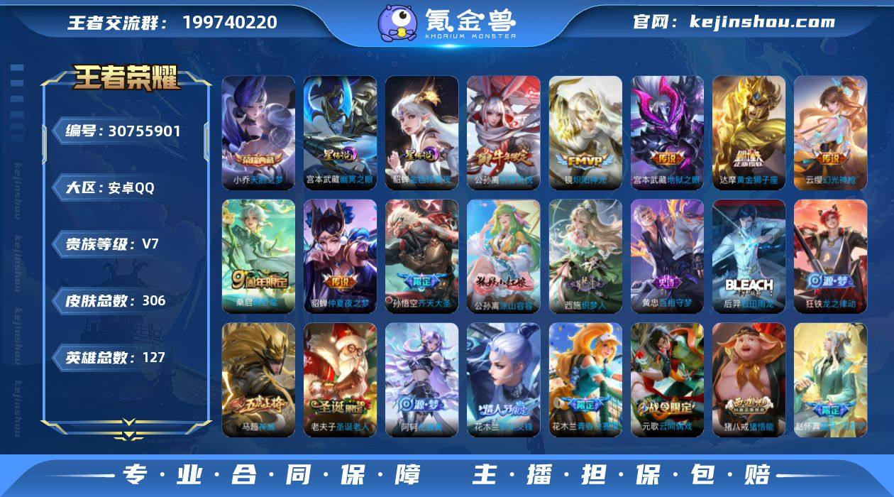 实名: 可修改 性别: 男号 贵族等级: V7 英雄数: 127 皮肤数: 306 荣耀水晶: 天鹅之梦 星传说: 幽冥之眼,金色仲夏夜 传说皮: 黄金狮子座,炽阳神光,仲夏夜之梦,地狱之眼,幻光神枪 限定皮: 遇见飞天,李小龙,祈雪灵祝,游园惊梦,梁祝,神威,飞衡,青春决赛季,默契交锋-花木兰,高山流水,圣诞老人,猪悟能,五谷丰年,齐天大圣,鸣野蒿