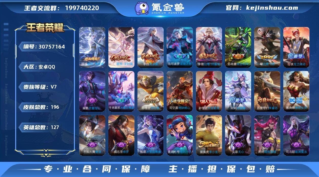 【XY251】贵族7/皮肤196/传说6/史诗63/英雄127/器灵·落星盏/愿照·岁时盈/山海·炽霜斩/深海之息/云鹰飞将/凤求凰/末日机甲-孙尚香/狰(s8)/阴阳师/凯尔特女王(s7)/皇家上将/白昼王子/蔷薇恋人/蜃楼王(s4)/高山流水/妖精王(s5)/炼金王(s6)/重明(s11)/猎兽之王/无心/朔风刀(s17)/游园惊梦/烛龙(s10)/穷奇(s12)/魔术师/万华元夜(s22)/沙漠行僧(s26)/海滩派对/醍醐杖(s20)/演武夺筹(s23)/金庭之子(s27)/狮心王(s3)/大圣娶亲/孙行者/御旌(s15)/云中旅人(s29)/驱傩正仪(s24)/遇见飞天/冰霜恋舞曲/繁星吟游/饕餮(s9)/原初探秘者(s21)/五谷丰年/千军破阵(s25)/朱雀志/混沌棋(s18)/大漠名商(s28)/疑决卦(s19)/李小龙/擒涛扼浪(s31)/御狮(s13)/御霄(s14)/纤云弄巧/御銮(s16)/梁祝/拒霜思/探海日志(s32)/海盐诗旅(s30)/流音漫舞/地狱燃心/古海寻踪(s33)/百解令(蒙犽)/电玩小子/暗夜猫娘/未来纪元-赵云/圣诞恋歌/冰雪圆舞曲/偶像歌手/鬼剑武藏/水果甜心/魅力维加斯/金属风暴/圣诞狂欢/绅士熊喵/幽灵船长/千年之狐/水晶猎龙者/德古拉伯爵/乘风破浪/暗隐猎兽者/黄金分割率/心灵战警/冰冠公主/心灵骇客/特工魅影/曙光守护者/舞动绿茵/逐浪之夏/星夜王子/猫狗日记-孙策/鹰眼统帅/魅语/修罗/暗渊魔法/永昼/奇遇舞章/茶境仙/万物之道/化蝶舞/龙之律动/灵蛊蚀心/百相守梦-黄忠/涂山容容/女娲万灵启世/项羽九幽镇关/周瑜线条小狗/教廷特使/街头霸王/致命风华/大发明家/忍·炎影/星际陆战队(程咬金)/化身博士/玩偶对对碰/少女阿狸/死亡骑士/拳王/兔女郎/五福同心/万事如意/阿尔法小队/纽约教父/龙腾万里/海滩丽影/霸王丸/幻想奇妙夜/功夫老勺/掌控之力/敏锐之力/幻乐之宴/如懿/守护之力/科学大爆炸/虹云星官/奇妙博物学/丁香结/野性能量/归虚梦演-蒙犽/鲨炮海盗猫/次元突破/圆桌骑士(盾山)/秘密基地/瓷语鉴心/乓乓大师/铁甲之心/唤灵魔...