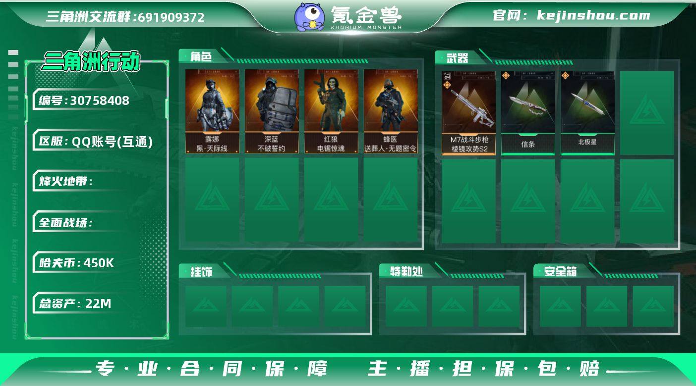 S917总资产22M,哈夫币45w,典藏1 近战3 枪皮数量164,露娜-黑天际线/红狼-蚀金玫瑰/红狼-电锯惊魂/深蓝-不破誓约/蜂医-送葬人无题密令,近战-信条/近战-北极星,M7战斗步枪-棱镜攻势S2(极品A)战场等级12列兵, 行动等级60铂金,安全箱等时效性道具请以游戏内数据为准,详情请看图