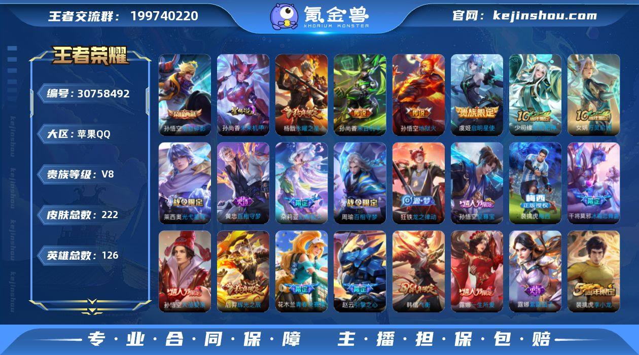 AL658152 【(元老级绝版稀有皮肤号)(连体和平精英 小丑鱼 冷酷挑战者 雪山精英 冰原使者 一把满级特效枪 ) (超稀有绝版梅西!) q等级高 主页好看 背包东西道具多 有个性按键 130个性动作 2个省标 9个区标 15个王者印记 热门皮肤 全息碎影 梅西 未来机甲 神树通天 永曜之星 启明星使 末日机甲 地狱火 灵启世 青焰无极 百相守梦 幻珠鲛人 飞衡 辉光之辰 一生所爱 大圣娶亲 至尊宝 青春决赛季 引擎之心 李小龙 梁祝 驯魔猎人 白昼王子 逐梦之星 逐梦之影 月团寄思 天秀启明 节奏热浪 星夜王子 冰冠公主 黄金分割率 暗隐猎兽者 德古拉伯爵 白龙吟 千年之狐 暗夜猫娘 圣诞恋歌 鬼剑武藏 紫霞仙子 圣诞狂欢 水果甜心 暗夜贵公子 未来纪元 原初追逐者 王者之锤 】 皮肤数222 传说皮肤数5 星传说皮肤数1 史诗皮肤数55 英雄数126 营地id352969010 贵族等级【文本】贵族8级 【贵族8级】 星元皮肤1 荣耀典藏1 内测皮肤1 年限皮肤3 限定皮肤66 赛季限定29 史诗皮肤54 战令限定12 勇者皮肤101 其他皮肤60 星元皮肤:孙尚香未来机甲; 荣耀典藏:孙悟空全息碎影; 内测皮肤:干将莫邪胡桃夹子; 年限皮肤:后羿辉光之辰,杨戬永曜之星,韩信飞衡; 限定皮肤:虞姬夏日便利店,少司缘巫礼祀神,女娲万灵启世,百里玄策原初追逐者,鬼谷子克喵,镜青焰无极,后羿辉光之辰,杨戬永曜之星,朵莉亚幻珠鲛人,狂铁龙之律动,钟馗虚灵犬护,桑启海盐诗旅,干将莫邪胡桃夹子,李元芳云中旅人,沈梦溪大漠名商,兰陵王金庭之子,达摩沙漠行僧,苏烈千军破阵,钟馗驱傩正仪,程咬金演武夺筹,狄仁杰万华元夜,虞姬启明星使,裴擒虎李小龙,鬼谷子原初探秘者,老夫子醍醐杖,明世隐疑决卦,李元芳银河之约,韩信飞衡,沈梦溪星空之诺,弈星混沌棋,兰陵王驯魔猎人,周瑜赤莲之焰,上官婉儿梁祝,夏侯惇朔风刀,狄仁杰鹰眼统帅,盾...