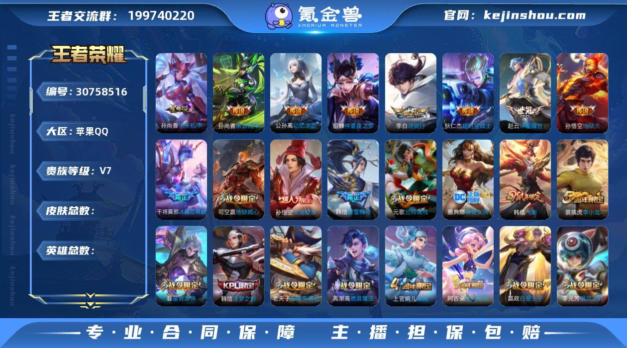 AL600366【贵族7】 星元皮肤1 年限皮肤5 传说皮肤6 热门限定12 情人节限定皮肤1 KPL限定1 战令限定20 贵族限定3 排位皮肤29 内测皮肤2 星元皮肤:孙尚香_未来机甲; 年限皮肤:阿古朵_江河有灵,马可波罗_山海玄木吟,裴擒虎_李小龙,韩信_飞衡,上官婉儿_梁祝; 传说皮肤:公孙离_记忆之芯,狄仁杰_超时空战,赵云_淬星耀世,孙尚香_末日机甲,貂蝉_仲夏夜之梦,孙悟空_地狱火; 热门限定:西施_雪境奇遇,嫦娥_拒霜思,蒙犽_百解令,太乙真人_劲辣红锅,李白_诗剑行,韩信_傲雪梅枪,鲁班七号_乒乒小将,干将莫邪_冰霜恋舞曲,云中君_纤云弄巧,雅典娜_神奇女侠,蔡文姬_繁星吟游,宫本武藏_霸王丸; 情人节限定皮肤:孙悟空_大圣娶亲; KPL限定:韩信_逐梦之影; 战令限定:鲁班七号蔬乡物语,李元芳_蔬乡物语,高渐离_燃音魔法,妲己_灵卜魔法,司空震_地狱燃心,艾琳_流音漫舞,扁鹊_奇幻香踪,杨戬_潮玩骑兵,暃_星界游侠,嫦娥_暖冬兔眠,老夫子_航海奇遇记,墨子_神迹守卫,元歌_云间偶戏,亚瑟_潮玩骑士王,蒙犽_狂想玩偶喵,雅典娜_单词大作战,李元芳_银河之约,沈梦溪_星空之诺,嬴政_白昼王子,吕布_猎兽之王; 贵族限定:狄仁杰_魔术师,赵云_皇家上将,项羽_海滩派对; 排位皮肤:姜子牙_天穹之誓,雅典娜_黎明之约,鬼谷子_天穹祈灯,蒙恬_荣光圣徽,张良_古海寻踪,鲁班大师_探海日志,裴擒虎_擒涛扼浪,桑启_海盐诗旅,达摩_沙漠行僧,钟馗_驱傩正仪,狄仁杰_万华元夜,百里玄策_原初追逐者,鬼谷子_原初探秘者,老夫子_醍醐杖,明世隐_疑决卦,弈星_混沌棋,夏侯惇_朔风刀,盾山_御銮,牛魔_御旌,米莱狄_御霄,狂铁_御狮,典韦_穷奇,芈月_重明,曹操_烛龙,太乙真人_饕餮,白起_狰,虞姬_凯尔特女王,扁鹊_炼金王,程咬金_演武夺筹; 内测皮肤:嬴政_优雅恋人,艾琳_女武神;