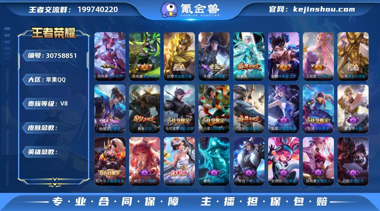 AL600559【贵族8】 荣耀典藏1 星元皮肤1 年限皮肤10 传说皮肤6 热门限定10 情人节限定皮肤2 战令限定8 贵族限定4 排位皮肤29 内测皮肤2 荣耀典藏:夏侯惇_无限飓风号; 星元皮肤:孙尚香_未来机甲; 年限皮肤:甄姬_游园惊梦,杨玉环_遇见飞天,裴擒虎_李小龙,鬼谷子_五谷丰年,庄周_高山流水,关羽_冰锋战神,典韦_岱宗,牛魔_奔雷神使,吕布_御风骁将,诸葛亮_时雨天司; 传说皮肤:张良_黄金白羊座,达摩_黄金狮子座,貂蝉_仲夏夜之梦,李信_一念神魔,王昭君_乞巧织情,孙尚香_末日机甲; 热门限定:孙悟空_零号赤焰,老夫子_圣诞老人,妲己_热情桑巴,赵云_引擎之心,芈月_白晶晶,嫦娥_拒霜思,云中君_纤云弄巧,干将莫邪_冰霜恋舞曲,宫本武藏_霸王丸,太乙真人_劲辣红锅; 情人节限定皮肤:小乔_纯白花嫁,孙悟空_至尊宝; 战令限定:蒙犽_狂想玩偶喵,元歌_云间偶戏,马可波罗_暗影游猎,狂铁_电玩高手,雅典娜_单词大作战,猪八戒_西部大镖客,王昭君_午后时光,亚瑟_潮玩骑士王; 贵族限定:狄仁杰_魔术师,赵云_皇家上将,虞姬_启明星使,项羽_海滩派对; 排位皮肤:鲁班大师_探海日志,裴擒虎_擒涛扼浪,鬼谷子_天穹祈灯,鬼谷子_原初探秘者,兰陵王_金庭之子,程咬金_演武夺筹,老夫子_醍醐杖,弈星_混沌棋,白起_狰,庄周_蜃楼王,曹操_烛龙,李元芳_云中旅人,沈梦溪_大漠名商,桑启_海盐诗旅,米莱狄_御霄,盾山_御銮,明世隐_疑决卦,钟馗_驱傩正仪,虞姬_凯尔特女王,夏侯惇_朔风刀,达摩_沙漠行僧,孙膑_妖精王,苏烈_千军破阵,扁鹊_炼金王,芈月_重明,狂铁_御狮,狄仁杰_万华元夜,牛魔_御旌,太乙真人_饕餮; 内测皮肤:孙尚香_蔷薇恋人,高渐离_玩趣恶龙;