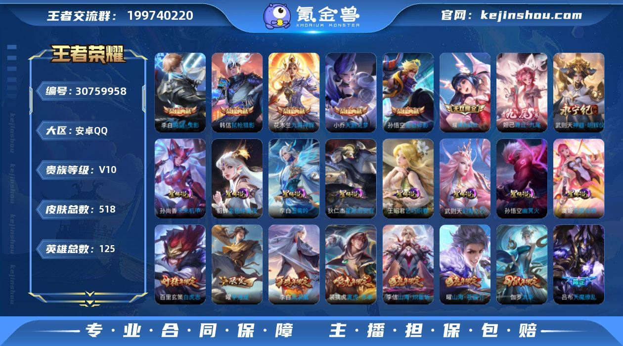 信用分不足实名: 可修改 贵族等级: V10 英雄数: 125 皮肤数: 518 荣耀水晶: 武则天,天鹅之梦,鸣剑·曳影,全息碎影,九霄神辉,弑枪猎影 无双皮: 真我赫兹(瑶),神器·明辉仪,青丘·九尾 星传说: 幻海之心,未来机甲,幽冥火,金色仲夏夜,星际治安官,无限倾慕,乞巧织春,玉鸾吟 传说皮: 黄金狮子座,黄金射手座,冠军飞将,云鹰飞将,绛天战甲,黄金白羊座,猫影幻舞,久胜战神,炽阳神光,一念神魔,云霓雀翎,末日机甲-孙尚香,地狱火,仲夏夜之梦,音你心动-小乔,零号·赤焰,海洋之心,地狱之眼,飞鸢探春,音你心动-周瑜,胖达荣荣,李逍遥,乞巧织情,时之恋人-刘备,游龙清影,淬星耀世,超时空战士-狄仁杰,末日机甲-孙策,花朝如约,挚爱之约,挚爱花嫁,无双飞将,音你闪耀,碎云,神器·狴犴令,神器·明辉仪,山海·炽霜斩,山海·琳琅生,山海·苍雷引,炽翼辉光,燃星之曲,画中仙,浮生妄,记忆之芯,百相守梦(张飞),追逃游戏(亚瑟),追逃游戏(安琪拉),电玩·雷克斯,鹤羽星尊,灼幽烈阳,妄想实况,妄想奇谈,鹤归松栖(云缨),惊梅引,遇见神鼓,艾琳觅芳踪 限定皮: 冰锋战神,遇见飞天,李小龙,游园惊梦,梁祝,御风骁将,云端筑梦师,时雨天司,引擎之心,龙胆,武圣,烈魂,辉光之辰,异界灵契,玄嵩,岱宗,天狼溯光者,虎魄,天魔缭乱,神威,蜜橘之夏,永曜之星,幽恒,飞衡,乒乒小将,太华,天狼征服者,天狼狩猎者,冰霜恋舞曲,天狼运算者,逐梦之星,逐梦之影,神奇女侠,天狼绘梦者,凤求凰,寅虎·御盾,美猴王,白虎志,青龙志,玄武志,朱雀志,凤凰于飞,如梦令-嫦娥,纯白花嫁,至尊宝,真爱至上,一生所爱,武陵仙君,如梦令-后羿,大圣娶亲,寅虎·瑞焰,高山流水,孙行者,猪悟能,女儿国国王,傲雪梅枪,寅虎·赤拳,寅虎·心曲,寅虎·展翼,百木心枪,玉兔公主,启示之音,匿光决锋者,无尽星芒,唐三藏,五谷丰年,神器·万象笔,诗剑行,降魔,怒海麟威,山海·玄木吟,冰霜神祇,山海·碧波行,齐天大圣,无限倾心-虞姬,无限倾心-...