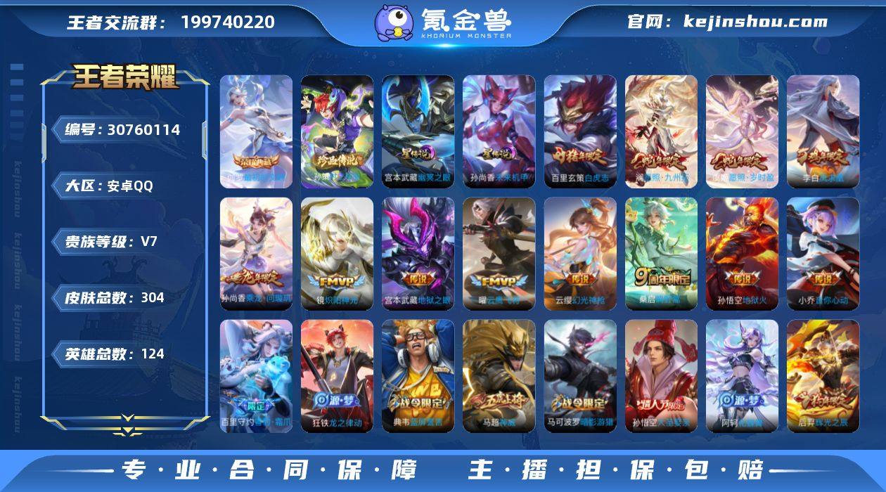 AL611993 【极品号302皮肤,2星传说】 皮肤数304 典藏皮肤数1 传说皮肤数12 珍品传说皮数1 星传说皮肤数2 史诗皮肤数73 英雄数124 贵族等级【文本】贵族7级 【贵族7级】 【可排位】 星元皮肤2 荣耀典藏1 珍品传说1 内测皮肤2 年限皮肤9 限定皮肤98 赛季限定39 史诗皮肤74 战令限定18 勇者皮肤149 其他皮肤66 星元皮肤:孙尚香未来机甲,宫本武藏幽冥之眼; 荣耀典藏:伽罗最初的交响; 珍品传说:孙策时之奇旅; 内测皮肤:姬小满妄想食味,孙尚香蔷薇恋人; 年限皮肤:虞姬愿照岁时盈,澜愿照九州拓,孙尚香乘龙问璇玑,马超神威,黄忠烈魂,后羿辉光之辰,韩信飞衡,李白凤求凰,百里玄策白虎志; 限定皮肤:百里守约雪豹霜爪,狂铁龙之律动,苏烈春野闲踪,钟馗虚灵犬护,阿轲化蝶舞,虞姬愿照岁时盈,赵怀真器灵浮梦炉,澜愿照九州拓,牛魔星界战将,太乙真人谧流熔炉,孙策时之奇旅,吕布逐霄战戟,甄姬游园惊梦,桑启鸣野蒿,沈梦溪龙舞盛年,东皇太一噬灭天穹,亚连破空之剑,孙悟空神迹守卫,姜子牙天穹之誓,梦奇顽趣,刘邦剑破天穹,姬小满妄想食味,高渐离燃音魔法,妲己灵卜魔法,孙尚香乘龙问璇玑,嫦娥漠中幻影,鬼谷子天穹祈灯,雅典娜黎明之约,嫦娥拒霜思,阿古朵江河有灵,张良古海寻踪,戈娅驭风魔法,西施玲珑珍味,鲁班大师探海日志,裴擒虎擒涛扼浪,桑启海盐诗旅,鬼谷子五谷丰年,孙尚香蔷薇恋人,李元芳云中旅人,兰陵王金庭之子,达摩沙漠行僧,庄周高山流水,钟馗驱傩正仪,程咬金演武夺筹,虞姬霸王别姬,狄仁杰万华元夜,百里玄策原初追逐者,云中君纤云弄巧,裴擒虎李小龙,鬼谷子原初探秘者,马可波罗暗影游猎,猪八戒西部大镖客,老夫子醍醐杖,马超神威,黄忠烈魂,明世隐疑决卦,李元芳银河之约,沈梦溪星空之诺,后羿辉光之辰,韩信飞衡,李白凤求凰,弈星混沌棋,狄仁杰鹰眼统...