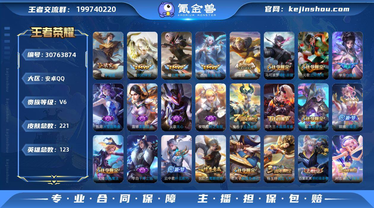 实名: 可修改 性别: 男号 贵族等级: V6 英雄数: 123 皮肤数: 221 荣耀水晶: 武则天 传说皮: 云鹰飞将,炽阳神光,李逍遥,游龙清影 限定皮: 遇见飞天,游园惊梦,白晶晶,天狼溯光者,高山流水,孙行者,五谷丰年
