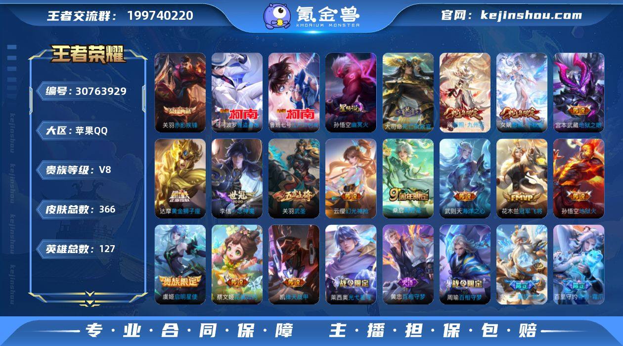 实名: 可修改 贵族等级: V8 英雄数: 127 皮肤数: 366 荣耀水晶: 赤影疾锋 珍品传说: 江户川柯南,怪盗基德 星传说: 幽冥火 传说皮: 黄金狮子座,冠军飞将,绛天战甲,一念神魔,地狱火,海洋之心,地狱之眼,花朝如约,幻光神枪,死亡执政官,神树通天,纵目迁山 限定皮: 冰锋战神,遇见飞天,李小龙,游园惊梦,梁祝,武圣,天狼溯光者,神威,飞衡,冰霜恋舞曲,天狼绘梦者,至尊宝,默契交锋-花木兰,高山流水,百木心枪,五谷丰年,鸣野蒿,陌上桑,逐霄战戟,愿照·千秋盛,愿照·九州拓