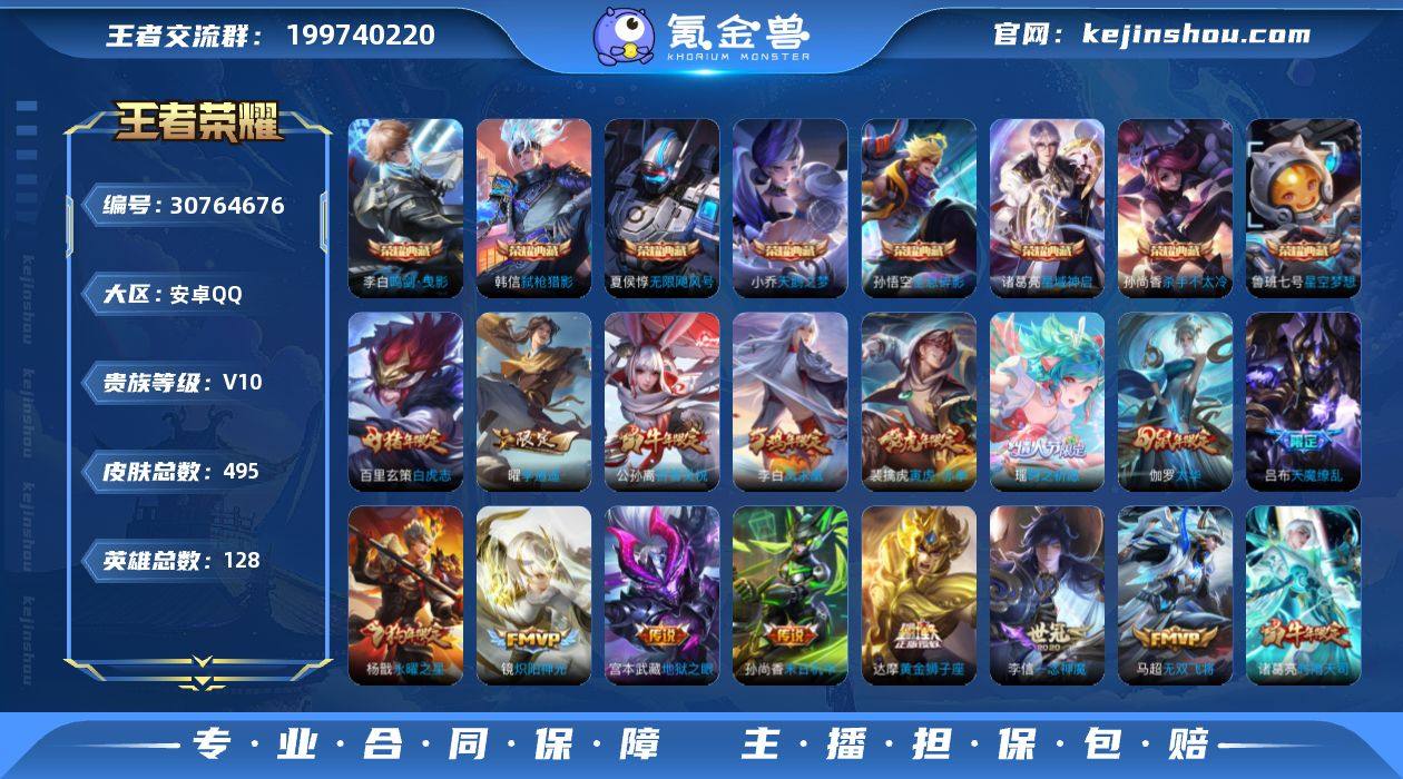 实名: 可修改 贵族等级: V10 英雄数: 128 皮肤数: 495 荣耀水晶: 武则天,天鹅之梦,星空梦想,无限飓风号,杀手不太冷,鸣剑·曳影,全息碎影,星域神启,弑枪猎影 传说皮: 黄金狮子座,黄金射手座,冠军飞将,云鹰飞将,绛天战甲,黄金白羊座,猫影幻舞,久胜战神,炽阳神光,一念神魔,云霓雀翎,末日机甲-孙尚香,地狱火,仲夏夜之梦,音你心动-小乔,零号·赤焰,海洋之心,地狱之眼,飞鸢探春,音你心动-周瑜,胖达荣荣,李逍遥,乞巧织情,时之恋人-刘备,游龙清影,淬星耀世,超时空战士-狄仁杰,遇见胡旋,末日机甲-孙策,花朝如约,挚爱之约,挚爱花嫁,无双飞将,艾琳觅芳踪 限定皮: 冰锋战神,遇见飞天,李小龙,奔雷神使,祈雪灵祝,游园惊梦,梁祝,御风骁将,云端筑梦师,时雨天司,引擎之心,龙胆,白鹤梁神女,武圣,烈魂,魔法小厨娘,辉光之辰,异界灵契,玄嵩,白晶晶,岱宗,天狼溯光者,虎魄,天魔缭乱,神威,蜜橘之夏,永曜之星,幽恒,时之彼端,奇迹圣诞,飞衡,乒乒小将,太华,天狼征服者,青春决赛季,逐梦之翼,天狼狩猎者,冰霜恋舞曲,天狼运算者,逐梦之星,逐梦之影,热情桑巴,逐梦之光,神奇女侠,天狼绘梦者,凤求凰,寅虎·御盾,美猴王,白虎志,青龙志,瑞麟志,玄武志,朱雀志,凤凰于飞,梅西,如梦令-嫦娥,纯白花嫁,至尊宝,默契交锋-兰陵王,真爱至上,一生所爱,武陵仙君,如梦令-后羿,大圣娶亲,默契交锋-花木兰,寅虎·瑞焰,霸王别姬-项羽,霸王别姬-虞姬,高山流水,孙行者,猪悟能,匿光追影者,女儿国国王,傲雪梅枪,寅虎·赤拳,寅虎·心曲,寅虎·展翼,时之祈愿-云中君,时之祈愿-瑶,补天,百木心枪,玉兔公主,启示之音,匿光决锋者,无尽星芒,前尘镜,枫霜尽,匿光启智者,时之奇旅-妲己,五谷丰年