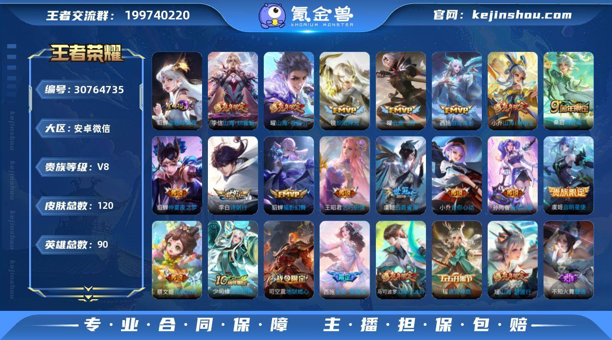 实名: 不可修改 性别: 女号 贵族等级: V8 英雄数: 90 皮肤数: 120 星传说: 金色仲夏夜 传说皮: 云鹰飞将,猫影幻舞,炽阳神光,云霓雀翎,仲夏夜之梦,音你心动-小乔,乞巧织情,游龙清影,花朝如约,音你闪耀,山海·炽霜斩,山海·琳琅生,山海·苍雷引 限定皮: 幽恒,飞衡,高山流水,五谷丰年,神器·万象笔,诗剑行,山海·玄木吟,山海·碧波行,至美·乘鲤谣,鸣野蒿
