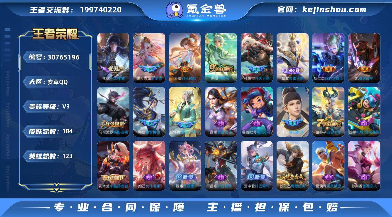 【商品标题】:安卓Q-V3-永恒钻石I段位-123英雄-184皮肤-0典藏-0珍品无双-0无双-0珍品传说-7传说-44史诗 【内测皮肤】:孙尚香蔷薇恋人,狂铁特工战影 【传说皮肤】:狄仁杰超时空战士,李信一念神魔,铠绛天战甲,孙悟空齐天大圣,桑启鸣野蒿,嬴政玄雷天君,云缨幻光神枪 【限定皮肤】:大乔绒语心约,姜子牙天穹之誓,李白谪仙醉月,狄仁杰阴阳师,赵云皇家上将,孙尚香蔷薇恋人,扁鹊奇幻香,编号:ZRZNP38
