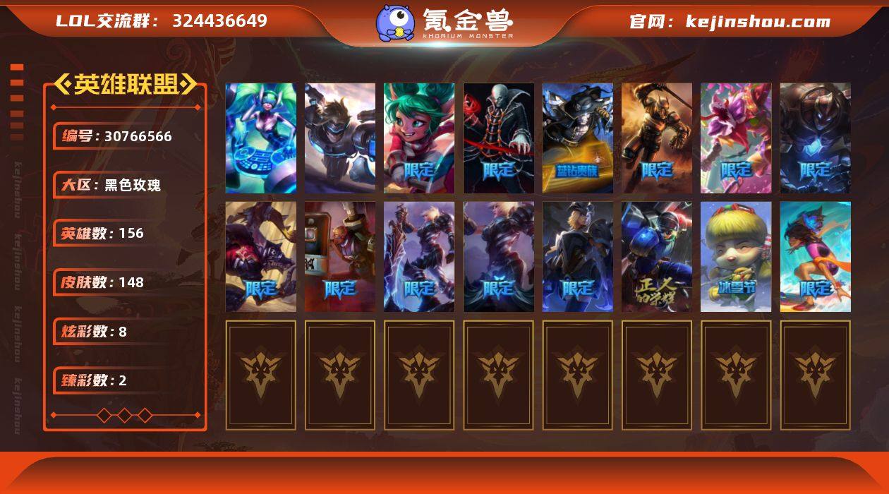 t30950 皇冠号【黑色玫瑰】148皮肤 8炫彩 2臻彩 0神话/29限定/8传说/156英雄 账号等级:200【重要皮肤】钢铁军团拉克丝 点心宝贝阿木木 龙的传人李青 胜利之树茂凯 胜利女神奥莉安娜 泳池派对塔莉垭 SKTT1阿兹尔 暗杀星努努和威朗普 暗杀星慎 冰雪节玛尔扎哈 防暴士兵辛吉德 防暴天使凯尔 冠军之刃锐雯 冠军之刃锐雯2016 冠军之血希瓦娜 鬼影森森茂凯 海贼瑞兹 惊悚派对费德提克 警用试作体K9内瑟斯 蓝色忧郁崔斯特 南瓜头费德提克 圣诞精灵崔丝塔娜 圣诞开心鬼提莫 圣诞老人古拉加斯 喜庆之树茂凯 机械迷城加里奥 诺斯费拉图弗拉基米尔 波比的巧克力工坊 都铎王朝图奇 DJ娑娜 未来战士伊泽瑞尔 【传说皮肤】星之守护者拉克丝 律政大亨蒙多 绅士科加斯 苍穹之光韦鲁斯 魔幻卡牌崔斯特 黯黑魔龙希瓦娜 腥红之月鬼武姬阿卡丽 霸天异形卡兹克 【重要炫彩】幻灵战斗兔锐雯梦幻强袭 冲击之刃劫风魔上忍
