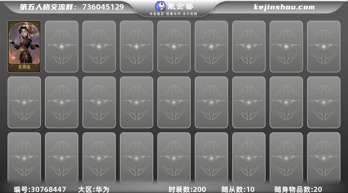 时装数:200 随从数:10 随身物品数:20 杂技演员-祈雨珠 卖家说:买来玩了一阵感觉没啥意思不想玩了 转手出了 号上有一个祈雨珠
