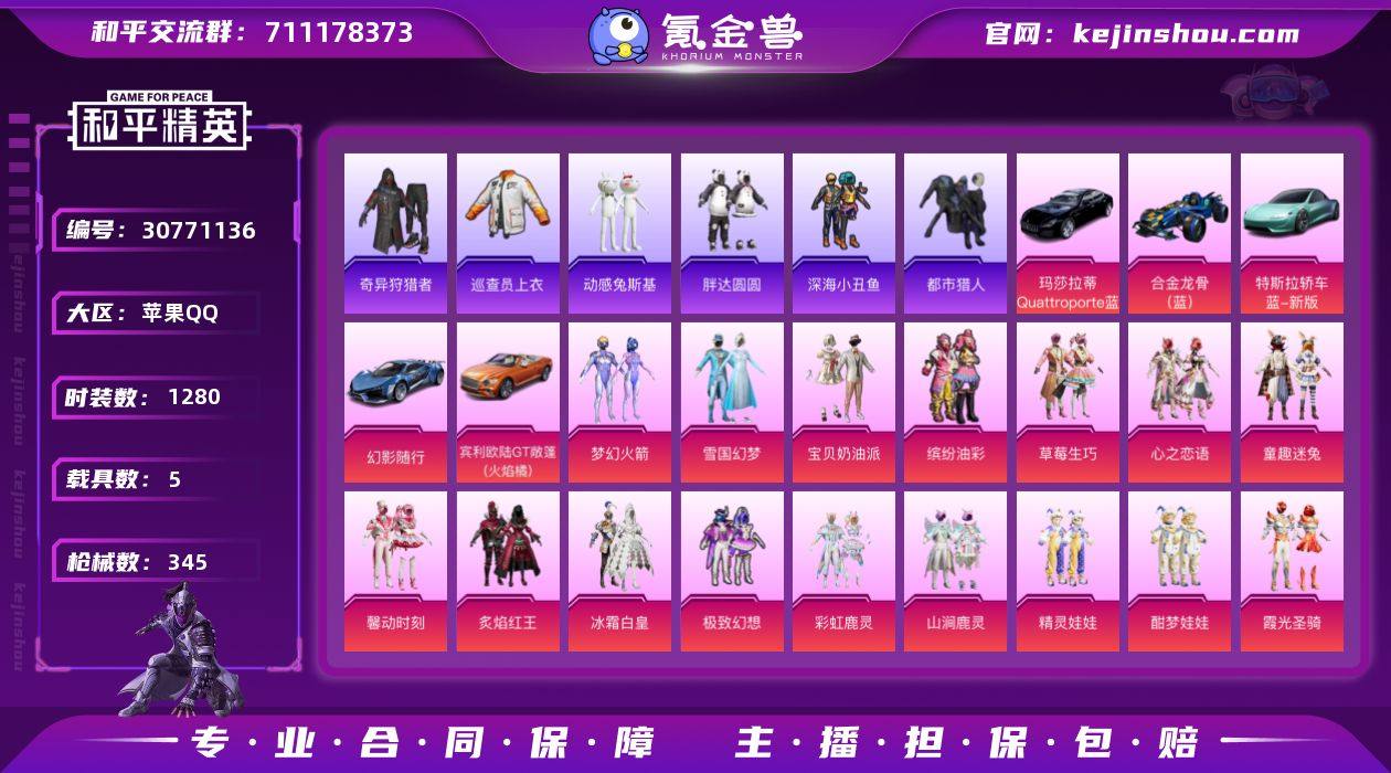 【可换绑 优质仙女号 战神框 22印记 】苹果Q- 雪国 童趣迷兔 猪妹 独舞天鹅 梦幻至情至圣7级 超新星 第五大道 巡查衣-15稀有6载具32粉装15特效枪40热门323套装342枪皮 135901热力值 22印记 历史无敌战神 【5稀有】 奇异狩猎者 巡查衣 AKM-缤纷海域 都市猎人 浪漫天命 【6载具】 宾利欧陆GT火焰橘 玛莎拉蒂Q蓝色 特斯拉R水滴蓝 合金龙骨蓝色 幻影随行 萌兔起飞僚机 【32粉装】 梦幻火箭 雪国幻梦 盖世英雄 白兰星 茉莉星 水仙星 宝贝奶油派 炫光之旅 白勺歌姬 呆萌星弥 小可学妹 闲梦青缨 酣梦娃娃 精灵娃娃 缤纷油彩 第五大道 心之回忆 心之恋语 极致幻想 草莓生巧 童趣迷兔 冰霜白皇 炙焰红王 霞光圣骑 馨动时刻 海螺星光 独舞天鹅 暗夜玫瑰 山涧鹿灵 彩虹鹿灵 寒光使者 复仇流浪者 【15特效枪】 SCAR-L-梦幻火箭 (1级) M416-五爪金龙 (1级) SCAR-L-纯梦嫁纱 (5级) M416-心之恋语 (1级) AKM-甜心宝贝 (5级) UMP45-雪国精灵 (7级) Kar98K-巳巳如意 (5级) Kar98K-伏魔团 (4级) AKM-百合蜜语 (2级) DP-28-豹影疾电 (4级) P90-能量风暴 (3级) AUG-超新星 (4级) Mk14-闲梦青缨 (3级) M416-至情至圣 (7级) SCAR-L-青春物语 (2级) 【40热门】 龟仙人 雪山精英 动感兔斯基 潮萌小黄鸭 爱崽白熊 梦魇先生 呆萌铁蟹 万圣娃娃 鹰眼刺客 软萌银虎 兔兔白日梦 恶魔喵喵 激萌罗小黑 迅捷狂鲨 灵绣 深海小丑鱼 浪漫波比 金羽特工 胖达圆圆 梦起落英 暗夜契约 暗影哥特 SS1特训 团圆交子 瑞龙福将 纯白誓言 忍者信条 水银刺客 狂沙舞者 漫步者 破蛋小黄鸡 风华少年志 白月香洋装 软嫩糖心蛋 军刀雅典娜 英勇保护者 弄潮海豚 M762-瑞龙福将 M24-激战未来 GROZA-林间仙鹿 【4飞行器】 伏魔团飞行器 心之恋语飞行翼 梦幻火箭飞行器 萌物绒绒飞行器 【7头盔】 梦幻火箭头盔 雪国精灵头盔 折纸暴龙头盔 甜心宝贝头盔 金风玉露头盔...