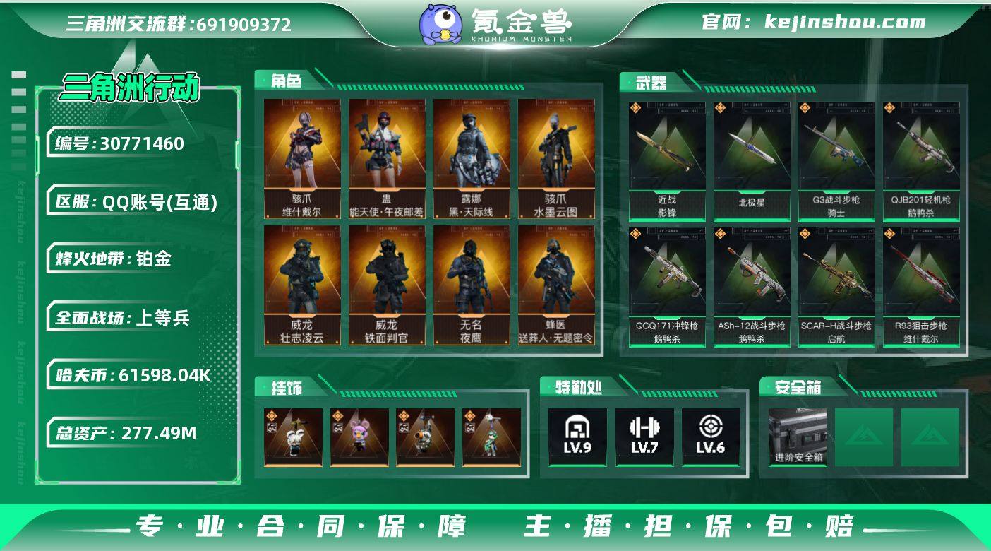 实名:不可二次实名 总资产:277.49M 哈夫币:61598.04K S7进阶安全箱(2x2) 烽火地带段位:铂金 烽火地带等级:60 全面战场段位:上等兵 全面战场等级:50 9级仓库,7级训练中心,6级靶场,2级潜水中心,1级收藏室