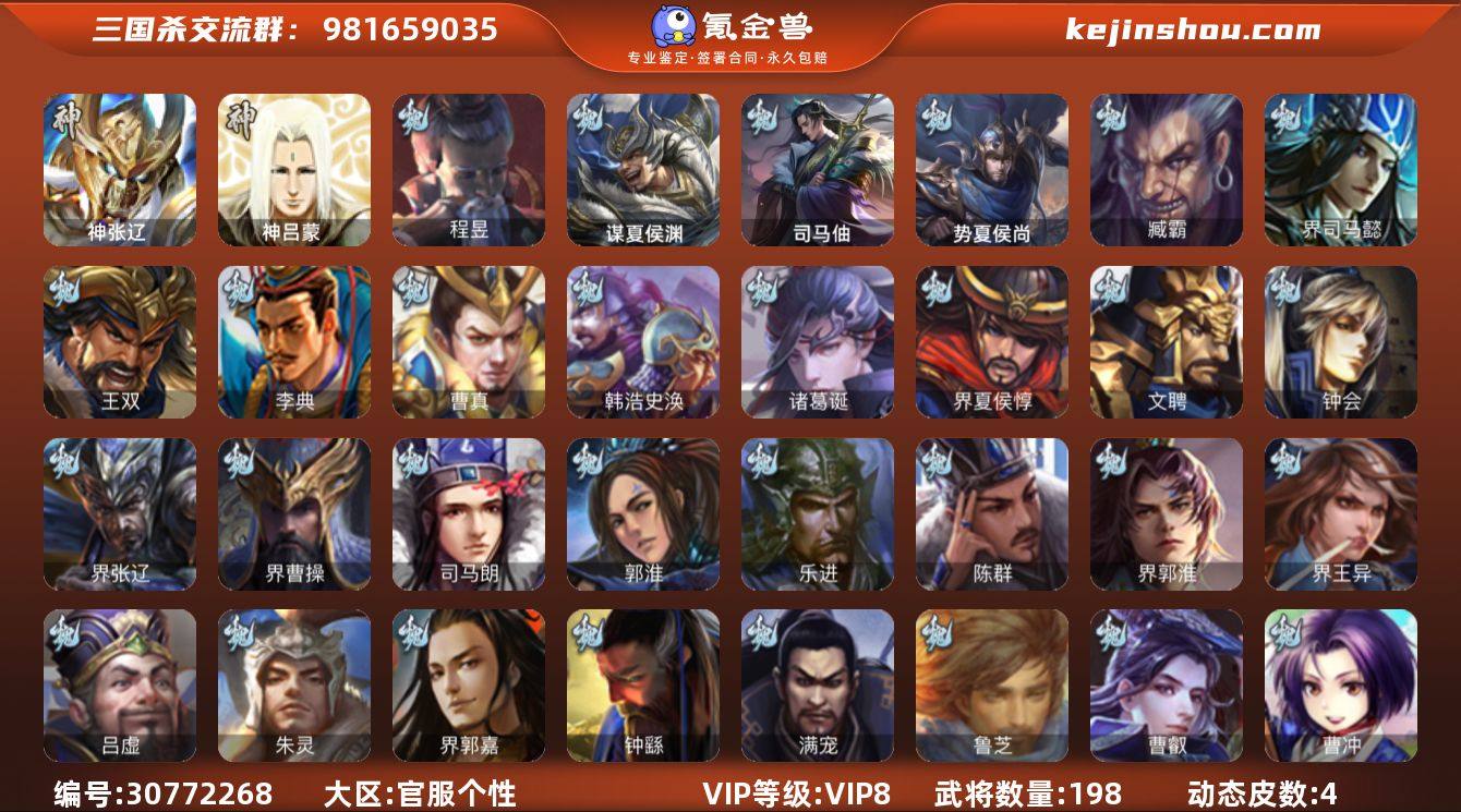 VIP等级: VIP5 官阶: 领军将军 武将数量: 207 动态皮肤数量: 8 魏国武将: 曹纯,程昱,杨修,唐咨-魏,徐庶,张辽,SP关羽,SP贾诩,SP姜维,SP庞德,卞夫人,曹昂,曹操,曹冲,曹洪,曹丕,曹仁,曹叡,王异,张恭,界满宠,满宠,荀攸,钟繇,蒯越蒯良,郭嘉,荀彧,界郭嘉,崔琰,界荀彧,朱灵,界王异,界郭淮,陈群,界曹休,乐进,辛宪英,郭淮,郭皇后,夏侯惇,司马朗,界曹操,许褚,界张辽,张郃,钟会,文聘,曹彰,界夏侯惇,诸葛诞,司马懿,甄姬,徐晃,孙资刘放,韩浩史涣,曹真,谋曹丕,典韦,夏侯渊,李典,于禁,邓艾,界司马懿,牛金,朱灵(国战),谋夏侯渊 蜀国武将: 花鬘,谯周,沙摩柯,徐庶,吕凯,界关羽,界伊籍,费祎,赵云,张松,彭羕,界刘备,刘封,糜竺,黄月英,关羽,王甫赵累,吴懿,祝融,张飞,魏延,刘禅,张翼,关银屏,SP孙尚香,SP徐庶,卧龙诸葛,宗预,周仓,界关兴张苞,诸葛亮,孙乾,界张飞,法正,界马岱,关平,马岱,界庞统,庞统,诸葛果,马谡,马超,廖化,关兴张苞,孟获,黄忠,刘备,界马超,马良,彭羕(国战),甘夫人,势陈到 吴国武将: 潘濬,周泰,吕蒙,诸葛恪,大乔小乔,许贡,丁奉,蒋钦,顾雍,界朱治,界孙权,祖茂,界吕蒙,凌操,朱治,孙尚香,程普,大乔,韩当,陆逊,诸葛瑾,太史慈,虞翻,界黄盖,孙鲁班,界周瑜,孙权,鲁肃,界甘宁,吴国太,甘宁,界大乔,孙坚,孙鲁育,步练师,周瑜,小乔,潘璋马忠,黄盖,孙策,界陆逊,吴-唐咨,徐盛,张昭张纮,界张昭张纮,朱桓,张布 群国武将: 界左慈,庞德公,伏完,刘协,华雄,袁术,高顺,于吉,界公孙瓒,吕布,张梁,李儒,界貂蝉,公孙瓒,SP赵云,蔡夫人,樊稠,潘凤,界袁术,界华佗,贾诩,庞德,刘表,董卓,何太后,张角,卢植,袁绍,华佗,刘虞,貂蝉,伏皇后,界颜良文丑,界吕布,严白虎,公孙渊,蔡邕,颜良文丑,张任,李傕郭汜,邹氏,马腾,纪灵,田丰,友庞统