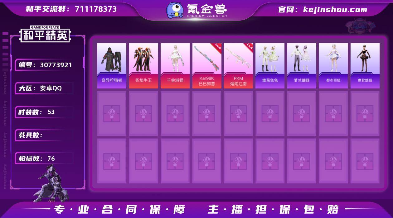 【商品标题】:安卓 手Q-2粉装-2特效枪-0载具-22811热力值-2印记-53套装-76枪皮 【特效枪等级】:Kar98K-巳巳如意(五级),PKM-江南烟雨(四级) 【优质套装】:粉装-炙焰牛王,角色-千金淑猫 【稀有套装】:套装-巳巳如意,套装-雏菊兔兔,套装-萝兰蝴蝶,套装-糖糖葫芦,套装-青团波波,角色-都市丽猫,角色-摩登魅猫 【优质武器皮肤】:Kar98K-巳巳如意,PKM-江南烟雨 【稀有武器皮肤】:AKM-夜灯,AKM-生命誓言,AKM-阿狸红,M16A4-夜灯,M16A4-生命誓言,M16A4-千金淑猫,SCAR-L-炫彩节奏,M416-潮汐统领,M416-红色方程式,GROZA-治愈之星,GROZA-马卡龙,AUG-耀粉歌者,QBZ-彩虹符号,M762-天降萌叽,M762-牛气冲天,M762-镭射皇者,Mk47-洛神天依,UZI-红色方程式,UMP45-绒宝小鹅,Vector-彩虹符号,Vector-治愈之星,Vector-香水柠檬,汤姆逊-奇异狩猎者,P90-巳巳如意,Kar98K-古堡领主,Kar98K-彩虹符号,Kar98K-王子的夏天,M24-治愈之星,M24-香水柠檬,SKS-心之恋语,VSS-镭射皇者,Mk14-治愈之星,S686-奇异狩猎者,S686-千金淑猫,S1897-镭射皇者,S12K-香水柠檬,S12K-夏日绵绵冰,M249-镭射皇者,P92-雷霆特警,蝎式手枪-千金淑猫,破片手榴弹-巳巳如意 【热门品类】:套装-奇异狩猎者 【其他套装】:套装-SS6特训,套装-SS7特训,套装-SS14特训,套装-北国孤狼,套装-幻影武者,套装-极速红龙,套装-海上生明月,套装-湖蓝色名流,套装-灼焰舞者,套装-牛气满满,套装-特战装甲,套装-特训学院,套装-白色伏地魔,套装-破蛋小黄鸡,套装-竞技勇士朋克,套装-红色运动,套装-绮丽涂鸦,套装-耀粉歌者,套装-萌趣颜团子,套装-萌黄之夏,套装-街头潮人,套装-霓虹街区,套装-青年教官,套装-黑色伏地魔,套装-奇异狩猎者,套装-金耀舞者,套装-蓝调潮人,套装-贵族骑装,套装-弄潮海豚,套装-幻影...