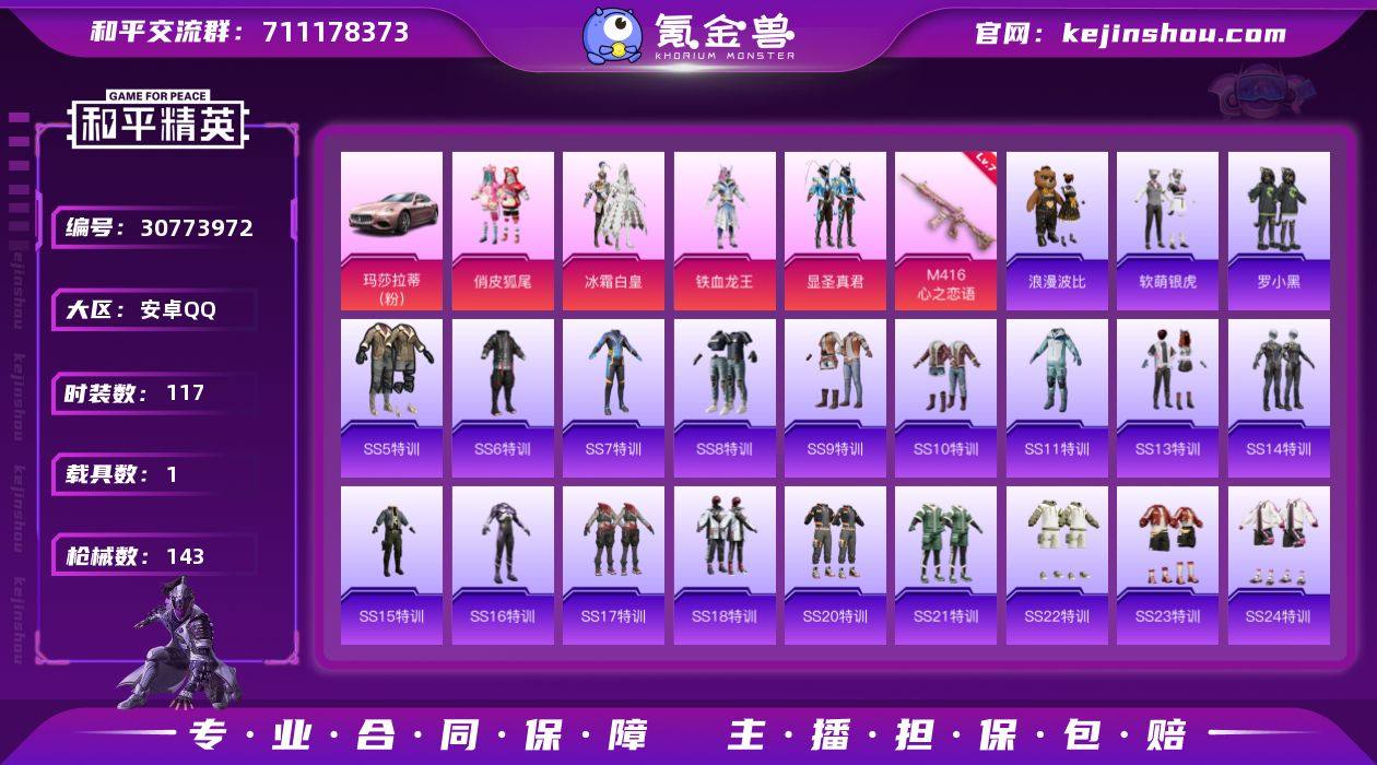 【mhp876】安卓 手Q-4粉装-1特效枪-1载具-45751热力值-2印记-117套装-143枪皮 【稀有载具】:玛莎拉蒂Ghibli(粉) 【特效枪等级】:M416-心之恋语(七级) 【优质套装】:粉装-俏皮狐尾,粉装-冰霜白皇,粉装-铁血龙王,粉装-显圣真君 【优质武器皮肤】:M416-心之恋语 【稀有武器皮肤】:AKM-阿狸红,M16A4-甜心亚梦,M16A4-红色方程式,SCAR-L-炫彩节奏,SCAR-L-玉兔迎春,SCAR-L-生命誓言,M416-仓鼠灰灰,M416-夜灯,M416-红色方程式,M416-蓝色火焰,GROZA-彩虹符号,GROZA-治愈之星,GROZA-田园牧歌,GROZA-黑色刀锋,AUG-耀粉歌者,AUG-青春冒险家,QBZ-妙趣可丽,QBZ-神秘黑猫,QBZ-银河战甲,M762-折纸暴龙,M762-瑞龙福将,M762-镭射皇者,Mk47-炫光之旅,Mk47-粉色回忆,Mk47-青春冒险家,G36C-不夜海上花,G36C-时空追击者,AC-VAL-天降萌叽,AC-VAL-甜心亚梦,蜜獾-娇憨猪猪,UZI-众神之王,UZI-古堡领主,UZI-娇憨猪猪,UMP45-时空追击者,UMP45-生命誓言,UMP45-蓝色火焰,Vector-治愈之星,Vector-生命誓言,Vector-田园牧歌,Vector-银河战甲,汤姆逊-勇闯险境,汤姆逊-耀粉歌者,汤姆逊-诡面斩,野牛-机械英豪,野牛-青春冒险家,MP5K-众神之王,Kar98K-梦幻火箭,Kar98K-红色方程式,M24-治愈之星,M24-众神之王,M24-冰封烈焰,AWM-不夜海上花,AWM-垂柳戏鸭,SKS-勇闯险境,SKS-时空追击者,VSS-田园牧歌,VSS-镭射皇者,VSS-黑色刀锋,Mini14-耀粉歌者,Mini14-阿狸红,Mk14-治愈之星,Win94-机械英豪,Win94-瑞龙福将,SLR-众神之王,SLR-娇憨猪猪,SLR-彩虹符号,QBU-不夜海上花,QBU-青春冒险家,M417-惊鸿侠骨,M200-惊鸿侠骨,S686-不夜海上花,S686-冰封烈焰,S1897-勇闯险境,S1897-天启纪元,S1897-暗夜鎏金,S1897-神秘黑猫,S1897-镭射皇者,S12K-玩趣呆呆,S12K-瑞龙福将,S12K-...