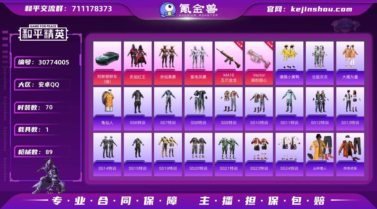 【mhp986】安卓 手Q-3粉装-2特效枪-1载具-1粉色飞行器-28717热力值-3王牌印记-70套装-89枪皮 【热门品类】:套装-龟仙人,套装-潮萌小黄鸭 【粉色载具】:阿斯顿马丁DBS(绿) 【粉色套装】:粉装-炙焰红王,粉装-赤焰黑爵,粉装-紫电风暴 【粉色枪皮等级】:M416-五爪金龙(五级),Vector-飒粉甜心(四级) 【粉色枪皮】:M416-五爪金龙,Vector-飒粉甜心 【粉色飞行器】:冷魅冰骑飞行器 【粉色降落伞】:四圣焕新降落伞,心之恋语降落伞,童趣迷兔降落伞,冷魅冰骑降落伞,仲夏莫吉托降落伞,飒粉甜心降落伞 【稀有套装】:套装-龟仙人 【稀有枪皮】:AKM-夜灯,AKM-破晓战魂,AKM-霓虹街区,M16A4-甜心亚梦,M16A4-蓝色火焰,SCAR-L-炫彩节奏,M416-蓝色火焰,GROZA-懵萌河马,GROZA-马卡龙,GROZA-黑色刀锋,AUG-天降萌叽,AUG-耀粉歌者,QBZ-原初圣火,QBZ-飞驰魅影,M762-天降萌叽,M762-拳皇97,M762-牛气冲天,M762-第五大道,M762-镭射皇者,Mk47-妙红点点,G36C-冷魅冰骑,G36C-懵萌河马,AC-VAL-甜心亚梦,UMP45-天启纪元,Vector-生命誓言,Vector-田园牧歌,Vector-黑色刀锋,汤姆逊-暗夜鎏金,P90-飞驰魅影,Kar98K-红色方程式,Kar98K-飞驰魅影,AWM-恐龙拽拽,AWM-王牌四分卫,SKS-夜灯,SKS-心之恋语,VSS-镭射皇者,VSS-黑色刀锋,Mini14-原初圣火,Mini14-炫彩节奏,SLR-月影鸳鸯,QBU-锦绣火鲤,莫辛纳甘-懵萌河马,AMR-妙红点点,S1897-镭射皇者,S1897-飞驰魅影,DBS-甜心亚梦,DBS-第五大道,M249-冷魅冰骑,M249-妙红点点,M249-拳皇97,M249-镭射皇者,DP-28-原初圣火,DP-28-清新柠檬,DP-28-甜心亚梦,MG3-妙红点点,PKM-懵萌河马,P92-拳皇97,P18C-原初圣火,沙漠之鹰-全功率超战 【其他套装】:套装-SS6特训,套装-SS7特训,套装-SS8特训,套装-SS9特训,套装-SS10特训,套装-SS11特...