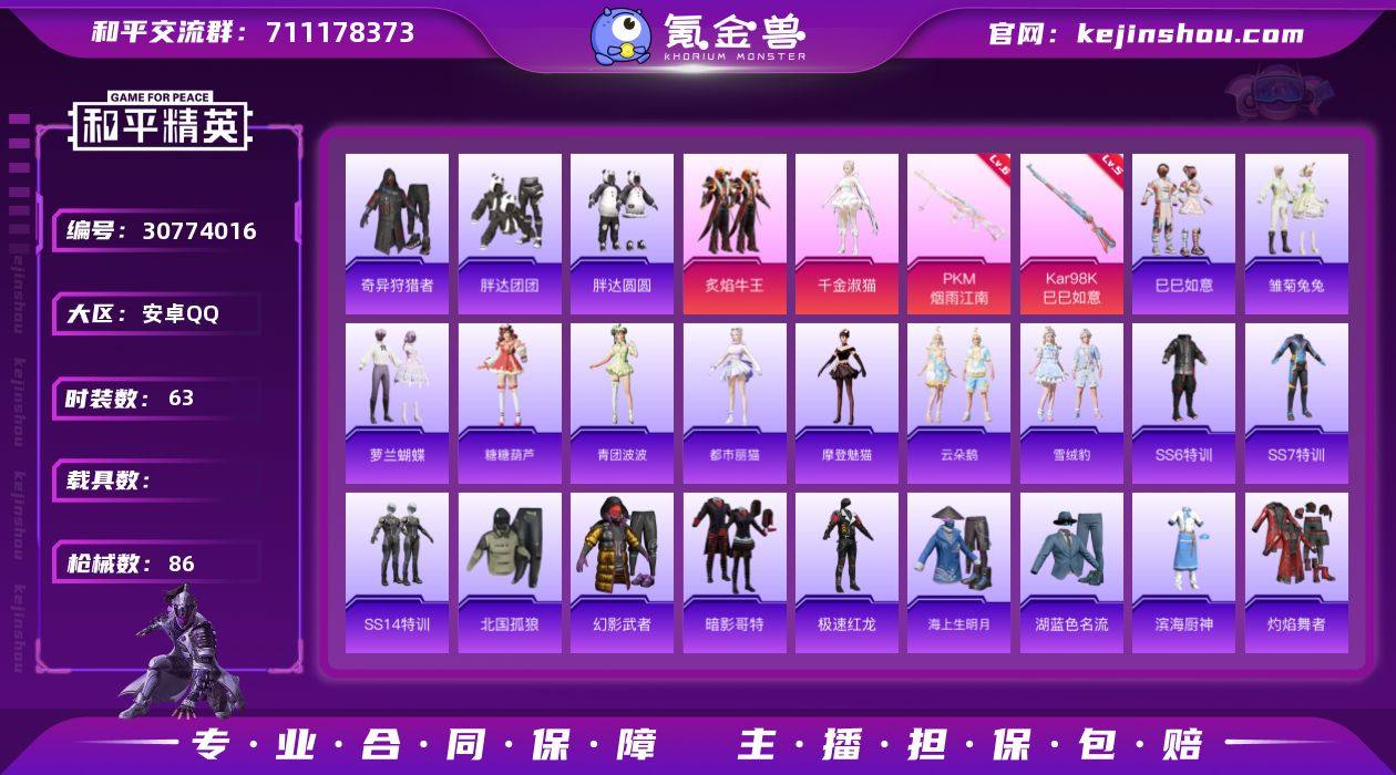 【mhp893】安卓 手Q-2粉装-2特效枪-0载具-26913热力值-1印记-63套装-86枪皮 【特效枪等级】:Kar98K-巳巳如意(五级),PKM-江南烟雨(六级) 【优质套装】:粉装-炙焰牛王,角色-千金淑猫 【稀有套装】:套装-巳巳如意,套装-雏菊兔兔,套装-萝兰蝴蝶,套装-糖糖葫芦,套装-青团波波,角色-都市丽猫,角色-摩登魅猫,套装-云朵鹅,套装-雪绒豹 【优质武器皮肤】:Kar98K-巳巳如意,PKM-江南烟雨 【稀有武器皮肤】:AKM-夜灯,AKM-生命誓言,AKM-阿狸红,M16A4-夜灯,M16A4-生命誓言,M16A4-千金淑猫,SCAR-L-炫彩节奏,M416-潮汐统领,M416-红色方程式,GROZA-治愈之星,GROZA-马卡龙,AUG-耀粉歌者,QBZ-彩虹符号,M762-天降萌叽,M762-牛气冲天,M762-镭射皇者,M762-云朵鹅,Mk47-洛神天依,AC-VAL-时光之吻,UZI-红色方程式,UMP45-生命誓言,UMP45-绒宝小鹅,Vector-彩虹符号,Vector-治愈之星,Vector-香水柠檬,汤姆逊-奇异狩猎者,P90-巳巳如意,Kar98K-古堡领主,Kar98K-彩虹符号,Kar98K-王子的夏天,M24-治愈之星,M24-香水柠檬,SKS-心之恋语,VSS-镭射皇者,Mk14-治愈之星,SVD-云朵鹅,S686-奇异狩猎者,S686-千金淑猫,S1897-镭射皇者,S12K-香水柠檬,S12K-夏日绵绵冰,SPAS-12-云朵鹅,M249-镭射皇者,P92-雷霆特警,蝎式手枪-千金淑猫,沙漠之鹰-云朵鹅,大砍刀-云朵鹅,破片手榴弹-巳巳如意 【热门品类】:套装-奇异狩猎者,套装-胖达团团,套装-胖达圆圆 【其他套装】:套装-SS6特训,套装-SS7特训,套装-SS14特训,套装-北国孤狼,套装-幻影武者,套装-暗影哥特,套装-极速红龙,套装-海上生明月,套装-湖蓝色名流,套装-滨海厨神,套装-灼焰舞者,套装-牛气满满,套装-特战装甲,套装-特训学院,套装-白色伏地魔,套装-破蛋小黄鸡,套装-竞技勇士朋克,套装-红色运动,套装-绮丽涂鸦,套装-耀...