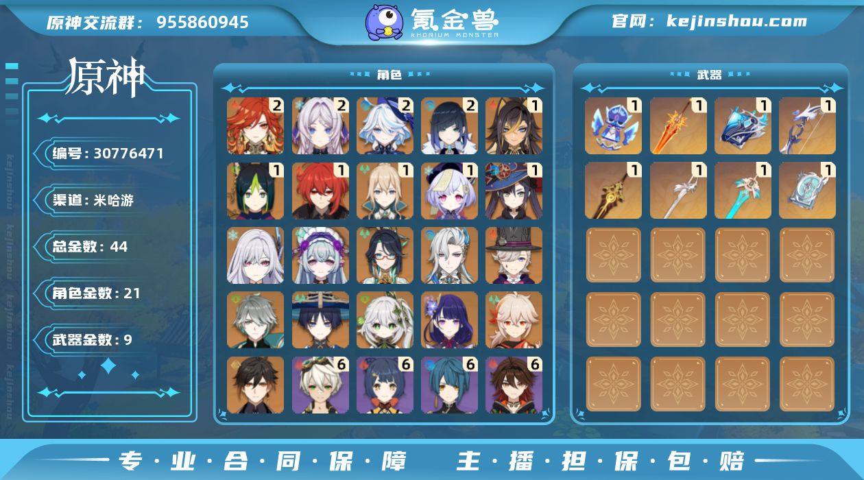 邮箱: 未绑定 总黄数: 44 冒险等级: 59 2命金色角色: 二命夜兰,二命芙宁娜,二命玛薇卡,二命茜特菈莉 1命金色角色: 一命迪卢克,一命七七,一命莫娜,一命琴,一命提纳里,一命迪希雅 0命金色角色: 枫原万叶,钟离,雷电将军,纳西妲,流浪者,艾尔海森,林尼,那维莱特,闲云,梦见月瑞希,丝柯克 拥有武器: 四风原典,风鹰剑,天空之刃,若水,苇海信标,万世流涌大典,焚曜千阳,祭星者之望 1精武器: 四风原典,风鹰剑,天空之刃,若水,苇海信标,万世流涌大典,焚曜千阳,祭星者之望