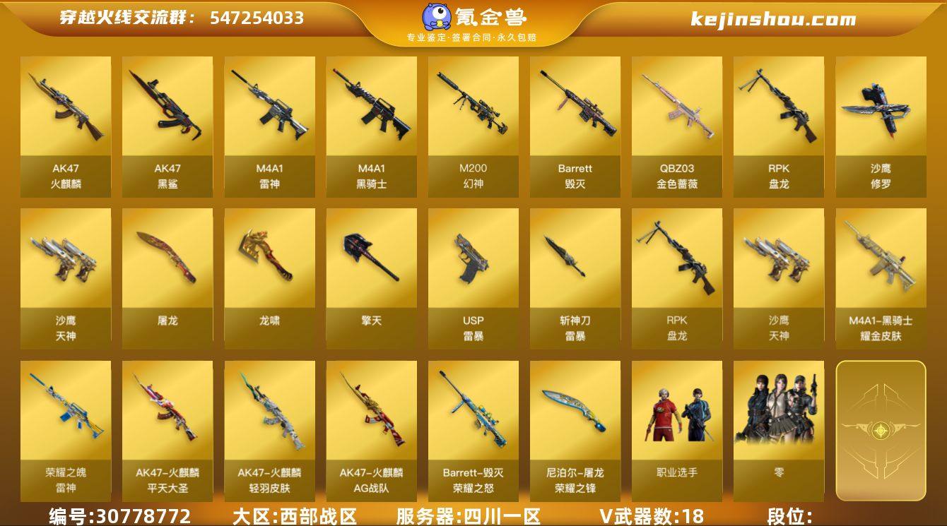 四川一区 可二次 M200-幻神 USP雷暴 Barrett-毁灭 (荣耀之怒) M4A1-雷神 (荣耀之魄) QBZ03-金色蔷薇 M4A1-黑骑士 AK47-火麒麟 AK雷暴 AK47-黑鲨 斯泰尔-蝴蝶 RPK-盘龙 M4A1-雷神-精英刀锋 AK47-B十周年 高爆手雷雷暴 *5 闪光弹雷暴 *5 烟雾弹雷暴 *5 【王者武器】 【副武器类型】 USP雷暴 COP-旗袍 沙鹰-修罗 *3 沙鹰-天神 Cfcolt1911大黄蜂 【近身武器类型】 屠龙 龙啸 擎天 斩神刀-雷暴 猫猫手套 夺魂 【稀有角色】 职业选手 零 麻雀 龙儿-小淘气 蜀雪 潘多拉X 暗夜X 铁骑荣耀 堕天使 超级护目镜 闪光护目镜 超级对讲机 【武器皮肤及道具】 雷神-荣耀之魄 火麒麟-轻羽 火麒麟-AG战队 火麒麟-平天大圣 毁灭-荣耀之怒 黑骑士耀金 屠龙-荣耀之锋 【稀有套装】 雷暴套 【腾讯信用分100】PX_1596913