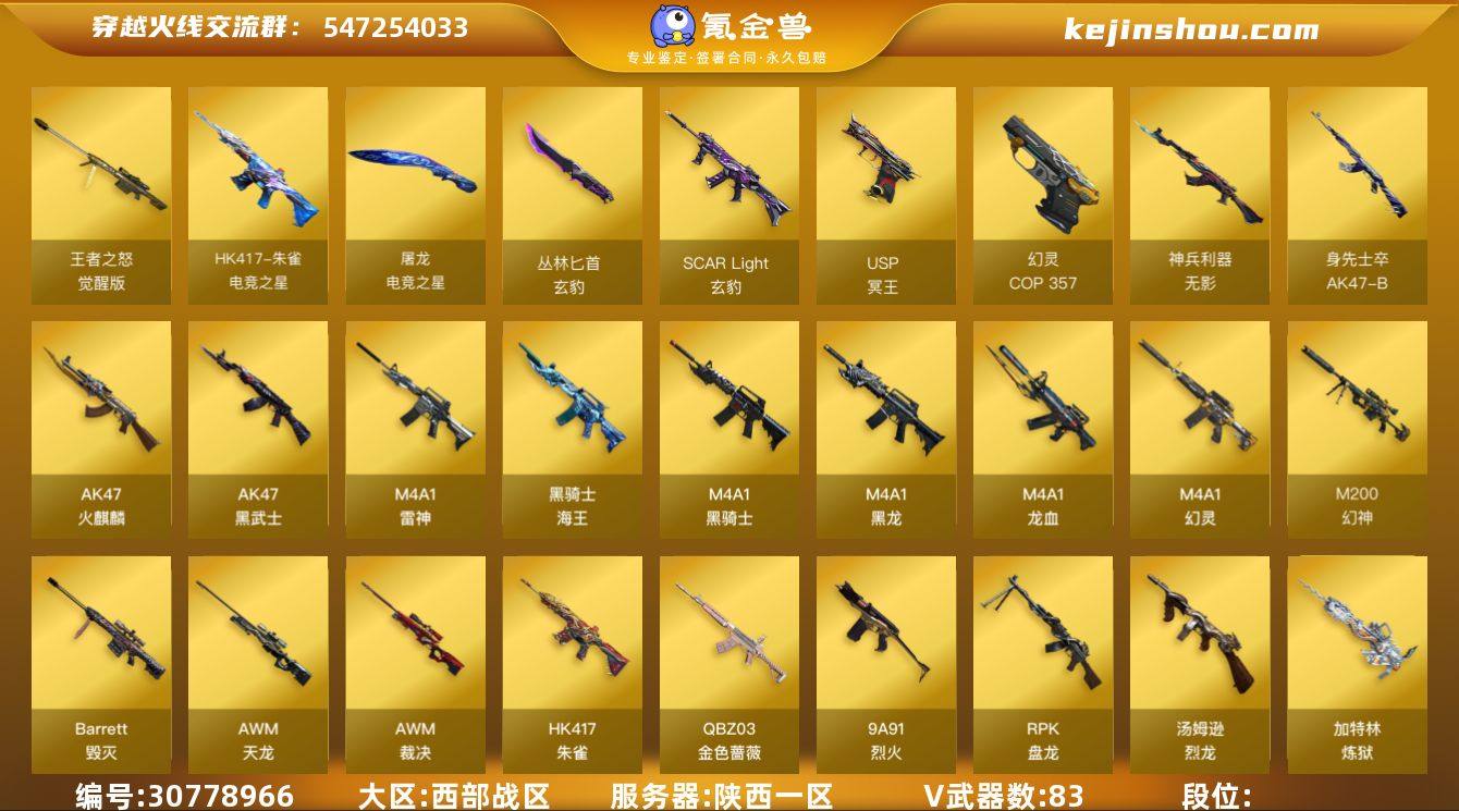 【FC-X6BPTW】 四防影煞/幻神 音效卡 宠儿 CFS/冠军之特/USP神工天巧/幻灵套/炽芒蝶刃/SCAR玄豹/USP冥王*2/裁决带皮/QBZ带皮/毁灭三件套/雷神三件套/黑骑士三件套/2盘1炼狱/3烈/ 陕西一区,等级102,王者武器1,炫金武器1,V武器83, 【英雄角色】传说影煞,王者-葵-貂蝉,玄豹,影豹,云海玲珑,幻面灵狐,灵狐者-黄金海岸,兰-海滩派对, 【V武器】M200-幻神,Barrett-毁灭,AWM-裁决,SCAR Light-玄豹,QBZ03-金色蔷薇,M4A1-幻灵,RPK-盘龙,加特林-炼狱,汤姆逊-烈龙,柯尔特-冠军之特,USP-神工天巧,USP-冥王,COP 357-幻灵,炽芒蝶刃,barrett-金色蔷薇,AWM-天龙,HK417-朱雀,M4A1-雷神,M4A1-黑骑士,M4A1-黑龙,M4A1-龙血,AK47-火麒麟,AK47-黑武士,AK47-B-身先士卒,AK47-B-战神,AK47-B-战士,AK47-B-常胜将军,9A91-烈火,无影-神兵利器,沙鹰-修罗,屠龙,丛林匕首-玄豹,麒麟刺,龙啸,擎天,擎天-竞技荣光,幻灵之锋,高爆手雷-玄豹,闪光弹-玄豹,烟雾弹-玄豹,高爆手雷-幻灵,闪光弹-幻灵,烟雾弹-幻灵,烟雾弹-竞技荣光,高爆手雷-神工天巧,闪光弹-神工天巧,烟雾弹-神工天巧,HK417-朱雀-电竞之星,屠龙-电竞之星,AK-47-猩红传说,黑骑士-海王, 【王者武器】王者之怒-觉醒版, 【狙击枪稀有皮肤】幻神-CFS2022,幻神-宠儿-2021MVP,裁决-运输船 皮肤,毁灭-荣耀之怒,毁灭-CFS2020,毁灭-星空,毁灭-黑大圣皮肤,天龙-CFSTAR, 【步枪稀有皮肤】雷神-荣耀之魄,雷神-宇航兔皮肤,雷神-能量核心,雷神-赛博朋克,雷神-冠军之魄,火麒麟-CFSTAR,火麒麟-暗月,火麒麟-心动糖果,火麒麟-平天大圣,火麒麟-枪娘凯特琳,火麒麟-百城,战神-粉色甜心皮肤,AK-47-雷神,M4A1-千变-孔明皮肤,黑骑士-摸金校尉,死神-秘银,AK47-B-常胜将军-孙权,AK47-B-常胜将军-刘备,战神-流金岁月皮肤,战...