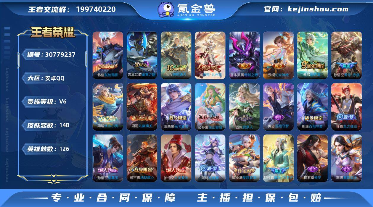 贵族等级:V6 典藏皮肤数:1 珍品无双皮肤数:0 无双皮肤数:0 珍品传说皮肤数:0 传说皮肤数:6 史诗皮肤数:48 皮肤数:148 英雄数:126 段位:星耀