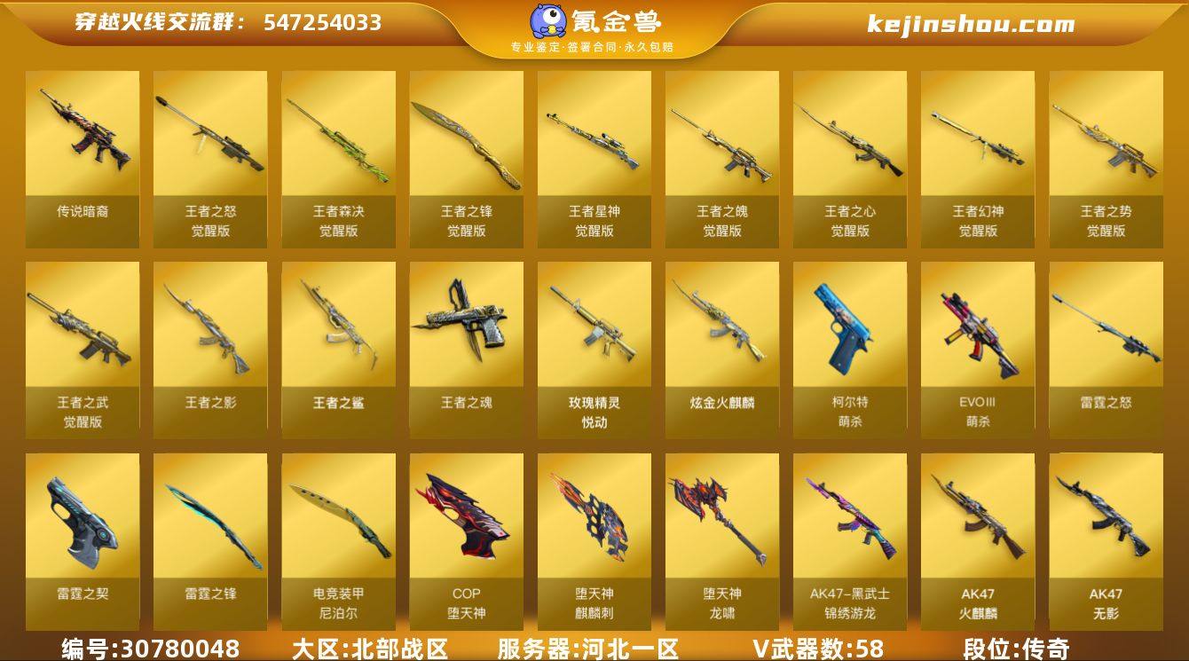 段位:传奇 VIP等级:VIP6 V武器数:58 王者武器数:13 炫金武器数:1 传说暗裔 王者之怒-觉醒版,王者森决-觉醒版,王者之锋-觉醒版,王者星神-觉醒版,王者之魄-觉醒版,王者之心-觉醒版,王者幻神-觉醒版,王者之势-觉醒版,王者之武-觉醒版,王者之影,王者之鲨,王者之魂,玫瑰精灵-悦动 炫金火麒麟 EVOⅢ-萌杀,柯尔特-萌杀,雷霆之怒,雷霆之契,雷霆之锋,尼泊尔-电竞装甲,COP-堕天神,麒麟刺-堕天神,龙啸-堕天神,AK47-黑武士-锦绣游龙,AK47-火麒麟,AK47-无影,AK47-黑鲨,AK47-黑武士,AK47-麒麟,AK47-机械迷城,M4A1-雷神,黑骑士-海王,M4A1-黑骑士,M4A1-死神,M4A1-黑龙,M4A1-堕天神,M4A1-青龙,M4A1-雷霆,M4A1-玫瑰精灵,白虎-电玩蓝兔,Barrett-毁灭,Barrett-朱雀,蔷薇大炮,AWM-天龙,AK12-天启,HK417-朱雀,QBZ03-金色蔷薇,Scar Light-白虎,9A91-烈火,屠龙,龙啸,麒麟刺,擎天,柯尔特-电竞装甲,斩神刀-雷暴,AK47-B-战士,AK47-B-战神,裁决,天神,破空枪刃-夜魔 王者-零,王者-魅影 荒漠琉璃,葵,灵动武士,兰-海滩派对,零,迷迭香,沙漠玫瑰,审判者,铁骑-乘风破浪,王者春,炫,樱,鹰 M4A1-黑骑士音效卡,M4A1-黑龙音效卡,Barrett-毁灭音效卡,M4A1-雷神音效卡,AK47-火麒麟音效卡