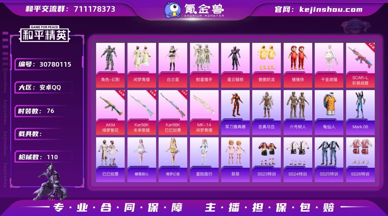 安卓手Q H-OWM0155【8粉装5特效枪4粉色飞行器 青龙偃月刀/军刀雅典娜/忠真马岱/龙胆亮银枪/六号树人/龟仙人/Mark.06/幻影/闲梦青缨/白兰星/射星猎手/星云暗核/傲傲奶龙/猪猪侠/千金淑猫/星际旅行/菲菲】36585热力值-7王牌印记-76套装-110枪皮 【热门品类】:大砍刀-青龙偃月刀,角色-军刀雅典娜,角色-忠真马岱,撬棍-龙胆亮银枪,套装-六号树人,套装-龟仙人,角色-Mark.06 【粉色套装】:角色-幻影,粉装-闲梦青缨,角色-白兰星,粉装-射星猎手,角色-星云暗核,粉装-