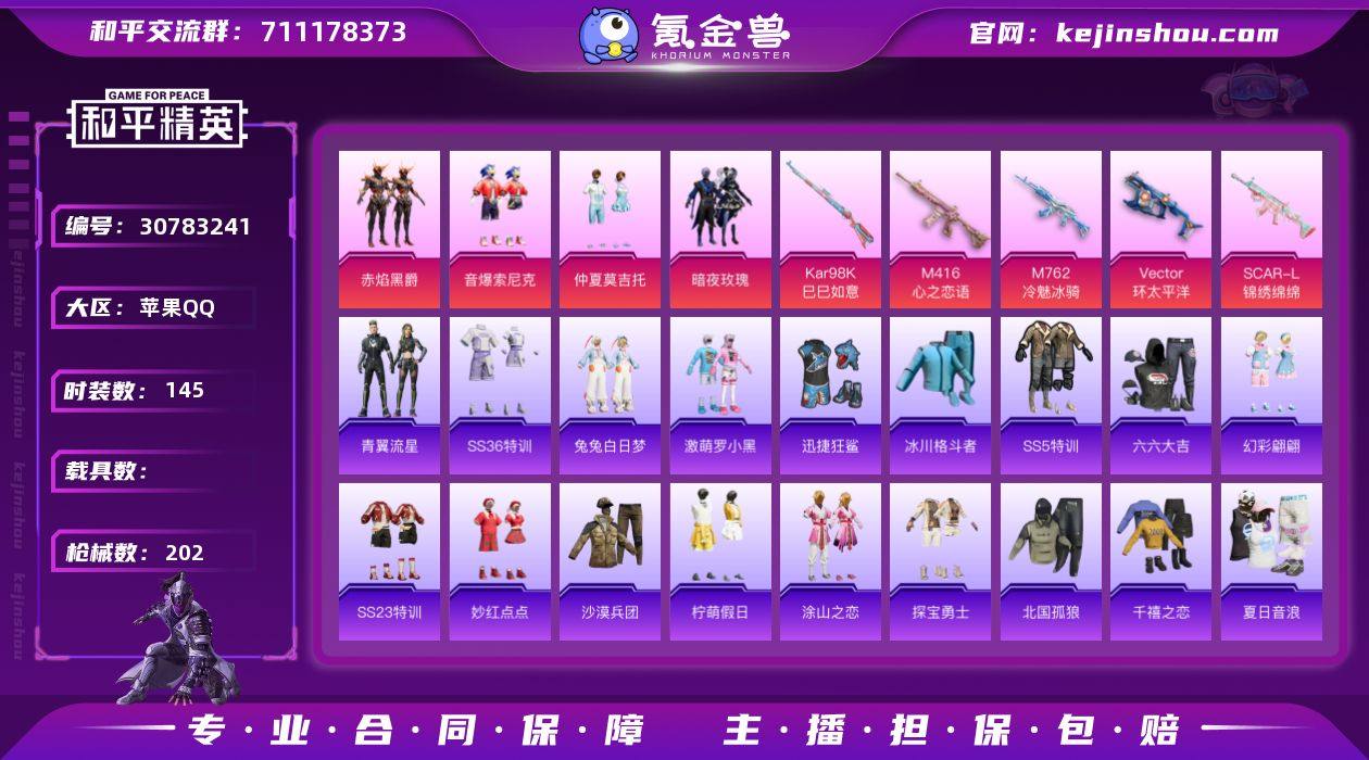 【3满级枪 仲夏莫吉托 音爆索尼克 梦幻火箭】iOS 可改实名 5特效枪3满级枪 5粉装 145套装 202枪械 仲夏莫吉托 音爆索尼克 梦幻火箭 赤焰黑爵 暗夜玫瑰 荧惑魅影 雪兔飞飞 炫光向阳 满级M416-心之恋语 满级Vector-环太平洋 满级M762-冷魅冰骑 5级Kar98K-巳巳如意 5级SCAR-L-锦绣绵绵 13王牌印记 65307热力值 N7341 和平精英买号永久包赔带二次营地ID:597539558