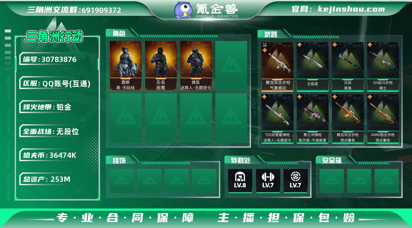 【SJ905】行动等级:60,总资产:253M,哈夫币:3656.9W,近战武器:近战武器-黑海,近战武器-北极星,干员皮肤:送葬人·无题密令,黑·天际线,夜鹰,典藏外观:腾龙突击步枪-气象感应,捞点薯条捆绑包,黑海捆绑包,特斯拉线圈捆绑包 【干员外观】:露娜-黑·天际线,蜂医-送葬人·无题密令,无名-夜鹰 【近战皮肤】:近战-黑海,近战-北极星,近战-黑鹰 【典藏外观】:腾龙突击步枪-气象感应 【传说外观】:M4A1突击步枪-阿米娅,AK-12突击步枪-夜鹰,AK-12突击步枪-特斯拉线圈,G3战斗步枪-骑士,CAR-15突击步枪-黑鹰坠落,CAR-15突击步枪-阿米娅,腾龙突击步枪-捞点薯条,K437突击步枪-北极星,MP5冲锋枪-黑海,UZI冲锋枪-特斯拉线圈,SR-3M紧凑突击步枪-特斯拉线圈,勇士冲锋枪-能天使-午夜邮差,QCQ171冲锋枪-北极星,725双管霰弹枪-送葬人-无题密令,QJB201轻机枪-黑海,AWM狙击步枪-捞点薯条,93R-捞点薯条,复合弓-黑·天际线 【史诗外观】:SMG-45冲锋枪-飓风行动,AKM突击步枪-林中猎手,ASh-12战斗步枪-守夜人,M16A4突击步枪-竞赛选手,SG552突击步枪-尖端治疗,SCAR-H战斗步枪-囚徒,AS Val突击步枪-尖端治疗,AS Val突击步枪-典狱官,腾龙突击步枪-无垢,MP5冲锋枪-深海恐惧,Vector冲锋枪-阿萨拉文明,SR-3M紧凑突击步枪-荒野求生,勇士冲锋枪-工业狂潮,MP7冲锋枪-无垢,M1014霰弹枪-林中猎手,PKM通用机枪-守夜人,PKM通用机枪-荒野求生,M250通用机枪-囚徒,SVD狙击步枪-阿萨拉工艺,SVD狙击步枪-荒野求生,SR-25射手步枪-尖端治疗,PSG-1射手步枪-无垢,SV-98狙击步枪-林中猎手,SV-98狙击步枪-囚徒,M700狙击步枪-竞技风,M700狙击步枪-守夜人,.357左轮-幸运时刻,沙漠之鹰-曙光 【稀有外观】:QBZ95-1突击步枪-公平竞技,K416突击步枪-黑骑士,K416突击步枪-虎啸,M16A4突击步枪-远航,SCAR-H战斗步枪-远...