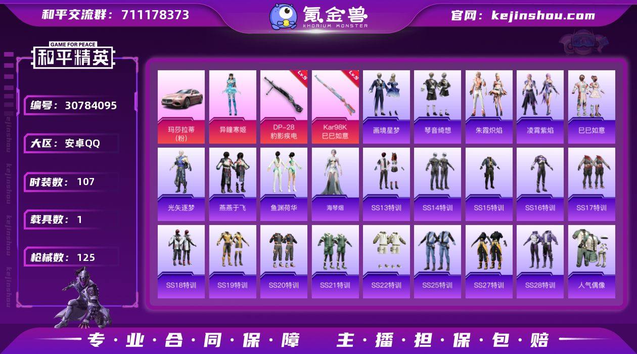 【AZH2398】安卓 手Q【异瞳寒姬 白兰地假日 碧青流霞 1载具】1粉装-2特效枪-1载具-1粉色飞行器-36703热力值-2王牌印记-107套装-125枪皮 【粉色套装】:角色-异瞳寒姬 【粉色枪皮等级】:Kar98K-巳巳如意(五级),DP-28-豹影疾电(五级) 【粉色载具】:玛莎拉蒂Ghibli(粉) 【粉色枪皮】:Kar98K-巳巳如意,DP-28-豹影疾电 【粉色降落伞】:银刃赛罗降落伞,垂柳戏鸭降落伞,月影灵韵降落伞,喜羊羊与灰太狼降落伞,炫彩糖果降落伞 【稀有套装】:套装-巳巳如意,套装-雪国风尚,套装-炫彩糖果,角色-光矢逐梦,套装-燕燕于飞,套装-鱼渊荷华,角色-海琴烟,套装-朱霞炽焰,套装-凌霄紫焰,套装-画境星梦,套装-琴音绮想,角色-碧青流霞 【稀有枪皮】:AUG-冰晶雪宝,AKM-夜灯,AKM-奇异狩猎者,AKM-生命誓言,AKM-破晓战魂,AKM-虎虎生威,AKM-龙的传人,M16A4-幻世战舞者,M16A4-红色方程式,M16A4-蓝色火焰,SCAR-L-炫彩节奏,SCAR-L-玉兔迎春,SCAR-L-红色方程式,M416-红色方程式,M416-蓝色火焰,GROZA-彩虹符号,GROZA-治愈之星,AUG-耀粉歌者,M762-天降萌叽,M762-登顶巅峰,Mk47-妙红点点,蜜獾-天降萌叽,ACE32-画境星梦,ARX-凌霄紫焰,UZI-啾咪啾咪,UZI-天降萌叽,UZI-炫彩节奏,UZI-红色方程式,UMP45-蓝色火焰,Vector-彩虹符号,Vector-治愈之星,汤姆逊-天降萌叽,汤姆逊-暗夜鎏金,汤姆逊-耀粉歌者,MP5K-画境星梦,JS9-凌霄紫焰,P90-巳巳如意,Kar98K-彩虹符号,Kar98K-红色方程式,M24-治愈之星,M24-奇异狩猎者,SKS-炫彩节奏,Mini14-炫彩节奏,Mini14-生命誓言,Mini14-耀粉歌者,Mk14-治愈之星,AMR-妙红点点,M1加兰德-画境星梦,S686-奇异狩猎者,S686-生命誓言,S686-红色方程式,S686-巳巳如意,S12K-破晓战魂,S12K-香水柠檬,S12K-垂柳戏鸭,S12K-幻世战舞者,AA12-G-画境星梦,M24...