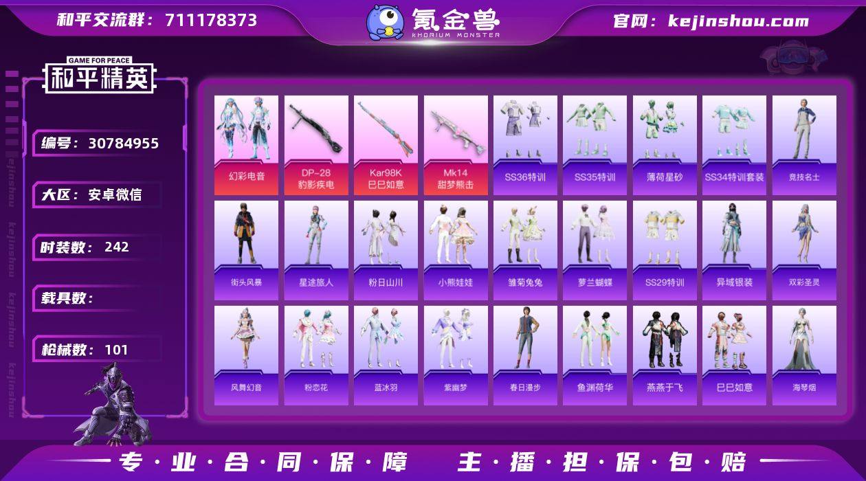 AL658475 【(微信限制 游戏一切正常)(地铁满天赋 地铁东西超级多!)】 热力值26832 枪皮数量101 粉装数11 套装数量58 时装数242 载具数0 战备数103 其他武器皮肤98 头盔43 战备16 其他武器皮肤:蜜獾-鸡智如我,蜜罐-精灵梦叶罗丽,蜜獾-乌木金纹,蜜獾-天降萌叽,M416-红色方程式,M416-萌萌史莱姆,Famas-乌木金纹,M762-雏菊兔兔,M762-云朵鹅,M762-果冻柠檬,M762-天降萌叽,AC-VAL-兔兔小魔女,SCAR-L-炫彩节奏,SCAR-L-星途旅人,SCAR-L-海盐豹豹,SCAR-L-夜灯,SCAR-L-玉兔迎春,M16A4-冰河战士,AKM-破晓战魂,GROZA-海盐豹豹,GROZA-影袭,QBZ-纯真浪花,G36C-星穹咏叹调,AUG-异域银装,AUG-耀粉歌者,M200-乌木金纹,Kar98K-星穹咏叹调,Kar98K-顶峰精英,SVD-冷漠罗丽,SVD-云朵鹅,AMR-鸡智如我,AWM-纯真浪花,Mini14-雏菊兔兔,Mini14-耀粉歌者,Mini14-鸡智如我,Mini14-香桃花海,M417-玩趣呆呆,MK20-H-狂鲨锋刃,MK20-H-乌木金纹,MK200-H-星途旅人,MK20-H-星梦奇缘,VSS-香桃花海,SKS-青瓷战姬,Mk14-紫幽梦,Mk14-冰河战士,Mk14-薄荷星砂,AKS-74U-乌木金纹,AKS-74U-鸡智如我,野牛-燕燕于飞,野牛-雏菊兔兔,UZI-天降萌叽,UZI-冰河战士,Vector-燕燕于飞,Vector-生命誓言,UMP45-海盐豹豹,UMP45-生命誓言,汤姆逊-纯真浪花,P90-巳巳如意,S1897-紫幽梦,S1897-精灵梦叶罗丽,S1897-糯团青竹,SPAS-12-云朵鹅,SPAS-12-燕燕于飞,SPAS-12-乌木金纹,S686-巳巳如意,S686-生命誓言,DBS-彩虹符号,DBS-乌木金纹,AA12-G-纯真浪花,S12K-玩趣呆呆,S12K-守护天翼,PKM-啾咪啾咪,PKM-紫幽梦,MG3-霓彩脉冲,MG3-幻世战舞者,MG3-桃粉嫣然,M249-糯团青竹,M249-金丰海韵,DP-28-彩虹符号,沙漠之鹰-云朵鹅,沙漠之鹰-未来领航者,TMP-9-萌萌史莱姆,蝎式手枪-燕燕于飞,P92-紫幽...