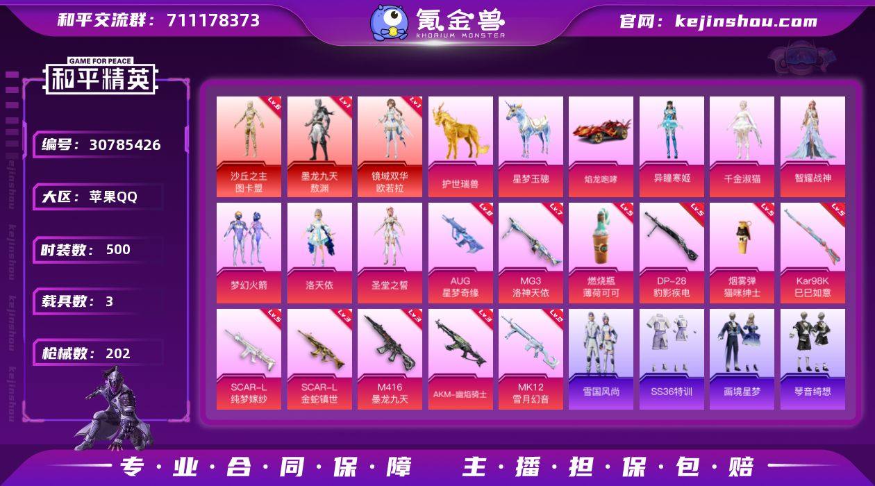 实名:可修改 时装数:1735 载具数:25 枪械数:586 战备数:410 二级圣域龙灵-瑞拉 六级玛莎拉蒂Grecale(幻星粉),六级宾利飞驰(皇家紫),三级路特斯EVIJA(电光紫) 2号机款机体服,傲傲奶龙,傲雪凌霜,暗夜鎏金,暗夜玫瑰,暗翼战神,宝贝奶油派,冰川粉黛,缤纷油彩,薄荷物语,冰霜白皇,初号机 觉醒Ver.,初号机款机体服,彩虹鹿灵,彩虹甜喵,超级赛亚人孙悟空,炙焰红王,迪迦闪耀型,凤凰座 一辉,放客神游,光明术士,诡面斩,盖世英雄,歌者泠鸢,黄蜂伯爵,花间之火,海螺星光,酣梦娃娃,黑伞漫漫,红伞翩翩,黄伞悠悠,飓风飞鹰,金风玉露,镜光幻境,精灵娃娃,金属狂野,极致幻想,恐龙拽拽,灵感创作师,零号机款机体服,葫芦兄弟,林间仙鹿,洛天依,流星咚咚,烈焰拳霸,莲影清波,绿野柔风,迷蝶贵族,梦幻火箭,麻辣鲜香锅,妙趣可丽,蜜桃特工,青葱仙萝,千面幻镜,绮梦青鸾,俏皮狐尾,蔷薇星,深海曼妙,守护骑士,赛罗闪耀型,萨利娅,天使彩虹糖,圣堂之誓,相思残雪,甜蜜誓约,童趣迷兔,甜心娃娃,天星战神,桀骜红莲,雪国幻梦,绚金战神,心之恋语,向日葵,香水柠檬,戏水时光,星之彼岸,旋转彩虹,星之信仰,音爆索尼克,玉鳞金羽,樱桃泡泡,挚爱序曲,智耀战神,庄周梦蝶 阿斯顿·马丁DBS(金),阿斯顿·马丁DBX(金),玛莎拉蒂Ghibli(金),双人摩托-双刃魅影(金),特斯拉Cybertruck(镭光铂),特斯拉Model 3(奇幻紫),特斯拉Roadster(尊享铂),金龙耀世,兰博基尼Aventador SVJ(尊享铂),兰博基尼URUS(尊享铂),特斯拉Model X(奇幻紫),合金龙骨(红),布尔玛摩托车,鬼马风驰,极速兔兔车,灵鼠银迹,路特斯ELETRE(花绽灰),萌喵橘座,玛莎拉蒂Ghibli(粉),星梦玉骢,照夜玉狮子 九级M416-至情至圣,七级AKM-甜心宝贝,七级AUG-星之彼岸,七级DP-28-圣堂之誓,七级Famas-初号机 觉醒Ver.,七级Groza-香水柠檬,七级M200-玉鳞金羽,七级M249-蓝莓炮弹,七级M416-五爪金龙,七级M762-鬼刀,七级MG3-洛神天依,七级Mini14-龙虾霸霸,七级P90-甜蜜草莓,七级PKM-天星战神,七级S12K-海渊国主,七级SCAR-L-梦幻火箭,七级SPAS-12-音爆索尼克,七级汤姆逊-怪笑疯兔,七级UMP45-相思残雪,七级UZI-绮梦青鸾,七级Vector-灵感创作师,七级野牛-流星咚咚,六级破片手榴弹-热量炸弹,五级DP-28-豹影疾电,五级爆炸猎弓-雪梅暗香,五级Kar98K-伏魔团,五级Kar98K-巳巳如意,五级Mk14-精灵梦叶罗丽,五级MK20-H-海螺星光,四级AWM-花间之火,四级DP-28-暗夜鎏金,四级M16A4-葫芦兄弟,四级M24-星之信仰,四级SCAR-L-童趣迷兔,四级SKS-诡面斩,四级SLR-暗夜玫瑰,四级VSS-烈焰拳霸,四级烟雾弹-丁香清露,三级平底锅-林间仙鹿,二级AUG-妙趣可丽,二级Kar98K-圣域龙灵,二级M249-彩虹甜喵,二级M416-心之恋语,二级M762-甜蜜誓约,一级AKM-炫紫旋律,一级AMR-智耀战神,一级DP-28-扶摇飞仙,一级DP-28-枪炮玫瑰,一级M249-古战神甲,一级MK14-樱桃泡泡,一级平底锅-仲夏莫吉托,一级UMP45-恐龙拽拽,一级Vector-红伞翩翩