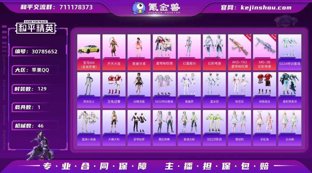 实名: 可修改 时装数: 129 载具数: 1 枪械数: 46 战备数: 42 热门装扮: 齐天大圣,歌者泠鸢,星穹咏叹调,幻星舰长,幻彩电音 载具: 宝马M4(圣保罗黄) 稀有枪皮: AKS-74U-星穹咏叹调,MG-36-幻彩电音