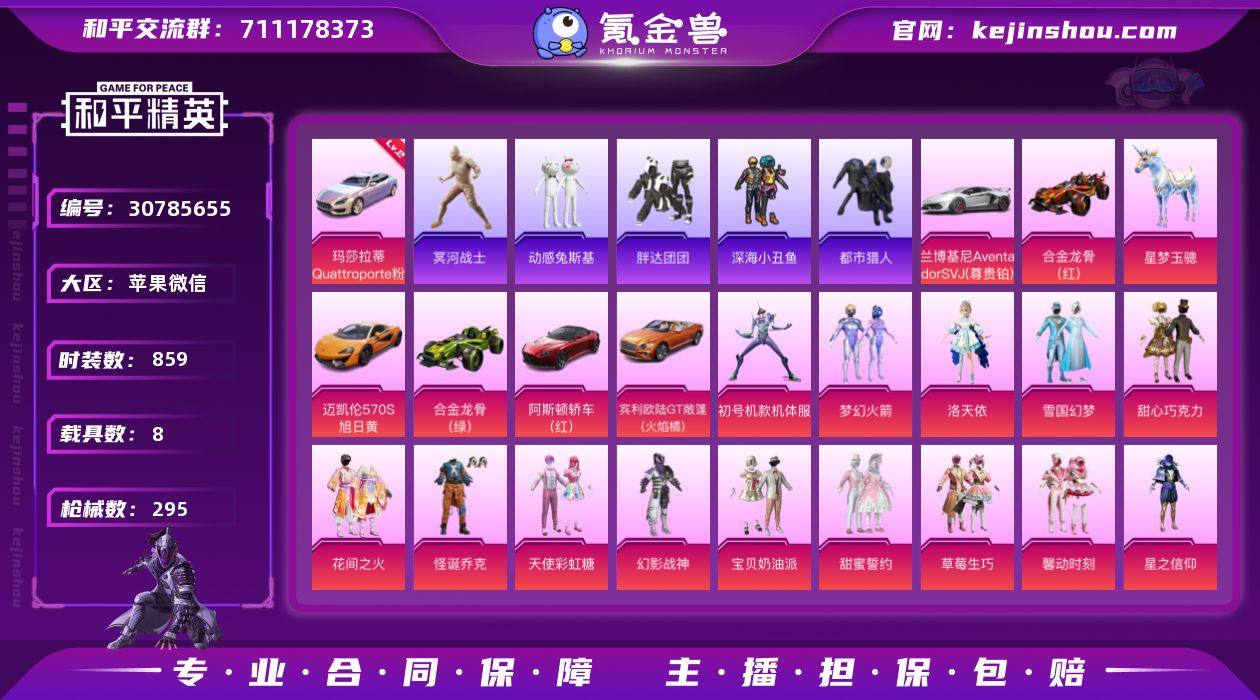 精氪素材号-怪诞-雪国-螳螂-木乃伊-巧克力三姐妹-胖达-粉熊背包-玛莎幻星粉-40粉23特8车实名: 可修改 时装数: 859 载具数: 8 枪械数: 295 战备数: 195 热门装扮: 梦幻火箭(新101),幻影战神,甜心巧克力,怪诞乔克,深海小丑鱼,星之信仰,宝贝奶油派,天使彩虹糖,放客神游,迅捷狂鲨,鹰眼刺客,智能音符,甜蜜誓约,都市猎人,黄伞悠悠,彗云及圣,天禅智恒,绚金战神,苍蓝魅影,草莓生巧,炙焰红王,花间之火,冰霜白皇,雪国幻梦,山涧鹿灵,星之彼岸,馨动时刻,虎啸骄阳,冥河战士,彩虹鹿灵,吟月归客,齐天大圣,洛天依,初号机款机体服,精灵娃娃,甜心娃娃,天之羽翼,海盐物语,银龙傲海,骨龙祭渊,紫电风暴,傲雪凌霜,潮萌小黄鸭,激萌罗小黑,胖达团团,动感兔斯基,兔兔白日梦,光明术士,炫光之旅,暗夜魅影,蜜语绒猫 载具: 阿斯顿·马丁DBS(红),合金龙骨(绿),合金龙骨(红),兰博基尼Aventador SVJ(尊享铂),僚机-萌兔起飞,玛莎拉蒂Quattroporte(幻星粉),迈凯伦570S(旭日黄),宾利欧陆GT敞篷(火焰橘),星梦玉骢 稀有枪皮: MG3洛神天依,UMP45雪国精灵,M416五爪金龙,AKM甜心宝贝,M416心之恋语,M762激战未来,SCAR-L童趣迷兔,Groza香水柠檬,UZI绮梦青鸾,AKM梦之光华,VSS烈焰拳霸,M762甜心娃娃,SCAR-L青春物语,M416暖熊萌萌,Vector灵感创作师,P90能量风暴,平底锅林间仙鹿,AUG超新星,破片手榴弹粉粉猫爪,烟雾弹猫咪绅士,破片手榴弹秋玉花灯,UMP45-宇宙意志,Kar98K-巳巳如意