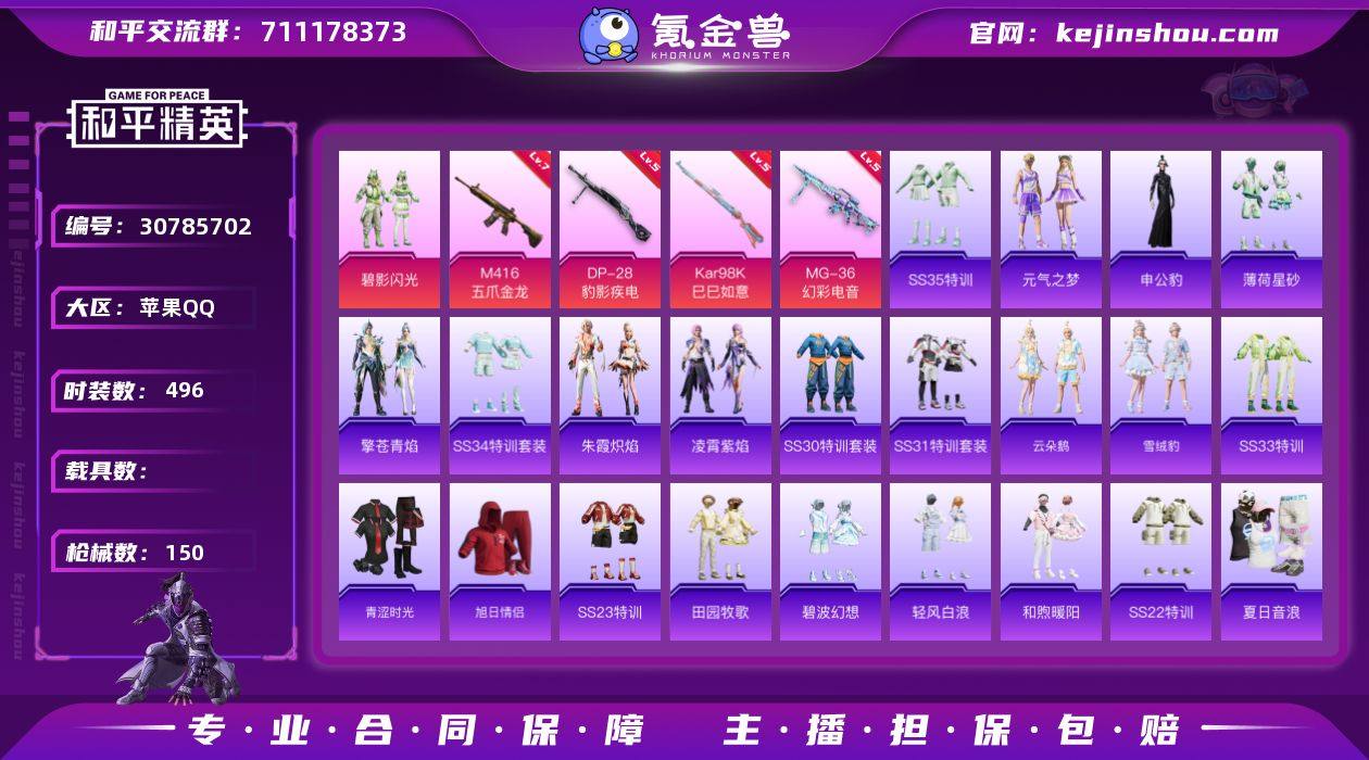 实名: 可修改 时装数: 496 枪械数: 150 战备数: 103 热门装扮: 碧影闪光 稀有枪皮: M416五爪金龙,Kar98K-巳巳如意,MG-36-幻彩电音,DP-28-豹影疾电