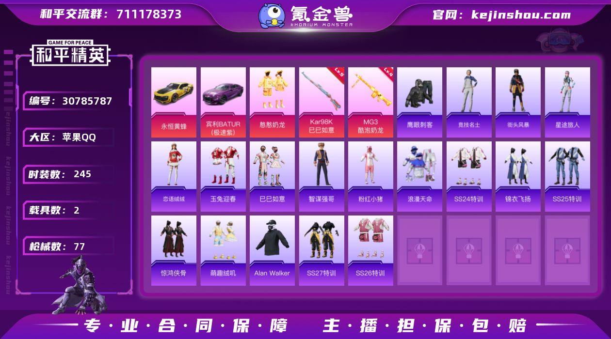 可实名苹果Q-奶龙1粉2特效枪2载具55个套装77个枪皮肤 实名: 可修改 时装数: 245 载具数: 2 枪械数: 77 战备数: 50 热门装扮: 鹰眼刺客,憨憨奶龙 载具: 永恒黄蜂,宾利BATUR(极速紫) 稀有枪皮: MG3酷泡奶龙,Kar98K-巳巳如意