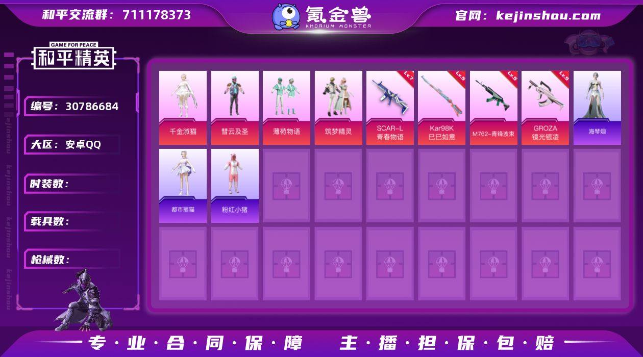 安卓 手Q-1粉装-3特效枪-0载具-0粉色飞行器-39913热力值-3王牌印记-123套装-156枪皮 【热门品类】:套装-都市猎人,套装-小丑鱼,套装-龟仙人 【粉色套装】:粉装-幻彩电音 【粉色枪皮等级】:Kar98K-巳巳如意(五级),Mk14-福马献瑞(四级),DP-28-豹影疾电(五级) 【粉色枪皮】:Kar98K-巳巳如意,Mk14-福马献瑞,DP-28-豹影疾电 【粉色降落伞】:未来歌姬降落伞,精灵梦叶罗丽降落伞,金丰海韵降落伞 【稀有套装】:套装-龟仙人,套装-巳巳如意,套装-雪国风尚,角色-临安公主,套装-燕燕于飞,套装-鱼渊荷华,套装-紫幽梦,套装-蓝冰羽,套装-星影赞美诗,套装-云朵鹅,套装-雪绒豹 【稀有枪皮】:AKM-彩虹符号,AKM-影袭,AKM-灼热熔岩,AKM-破晓战魂,AKM-缤纷海域,AKM-龙的传人,M16A4-幻世战舞者,SCAR-L-夜灯,SCAR-L-玉兔迎春,SCAR-L-红色方程式,M416-糯团青竹,M416-红色方程式,M416-蓝色火焰,GROZA-彩虹符号,GROZA-懵萌河马,GROZA-田园牧歌,AUG-耀粉歌者,QBZ-彩虹符号,M762-天降萌叽,M762-瑞龙福将,M762-云朵鹅,Mk47-妙红点点,G36C-懵萌河马,G36C-星穹咏叹调,AC-VAL-天降萌叽,蜜獾-天降萌叽,蜜獾-娇憨猪猪,UZI-娇憨猪猪,UMP45-夜灯,UMP45-涂山之恋,UMP45-生命誓言,UMP45-蓝色火焰,Vector-田园牧歌,汤姆逊-天降萌叽,汤姆逊-暗夜鎏金,汤姆逊-耀粉歌者,P90-巳巳如意,M24-炫彩节奏,AWM-黄金龙骨,SKS-糯团青竹,SKS-迅猛狂鲨,VSS-彩虹符号,VSS-田园牧歌,Mini14-涂山之恋,Mini14-炫彩节奏,Mini14-耀粉歌者,SLR-娇憨猪猪,SLR-彩虹符号,莫辛纳甘-懵萌河马,AMR-妙红点点,M417-惊鸿侠骨,M200-惊鸿侠骨,SVD-云朵鹅,S686-生命誓言,S686-红色方程式,S686-巳巳如意,S1897-炫彩节奏,S12K-玩趣呆呆,S12K-夜灯,S12K-娇憨猪猪,S12K-幻世战舞者,DBS-彩虹符号,DBS-幻彩...