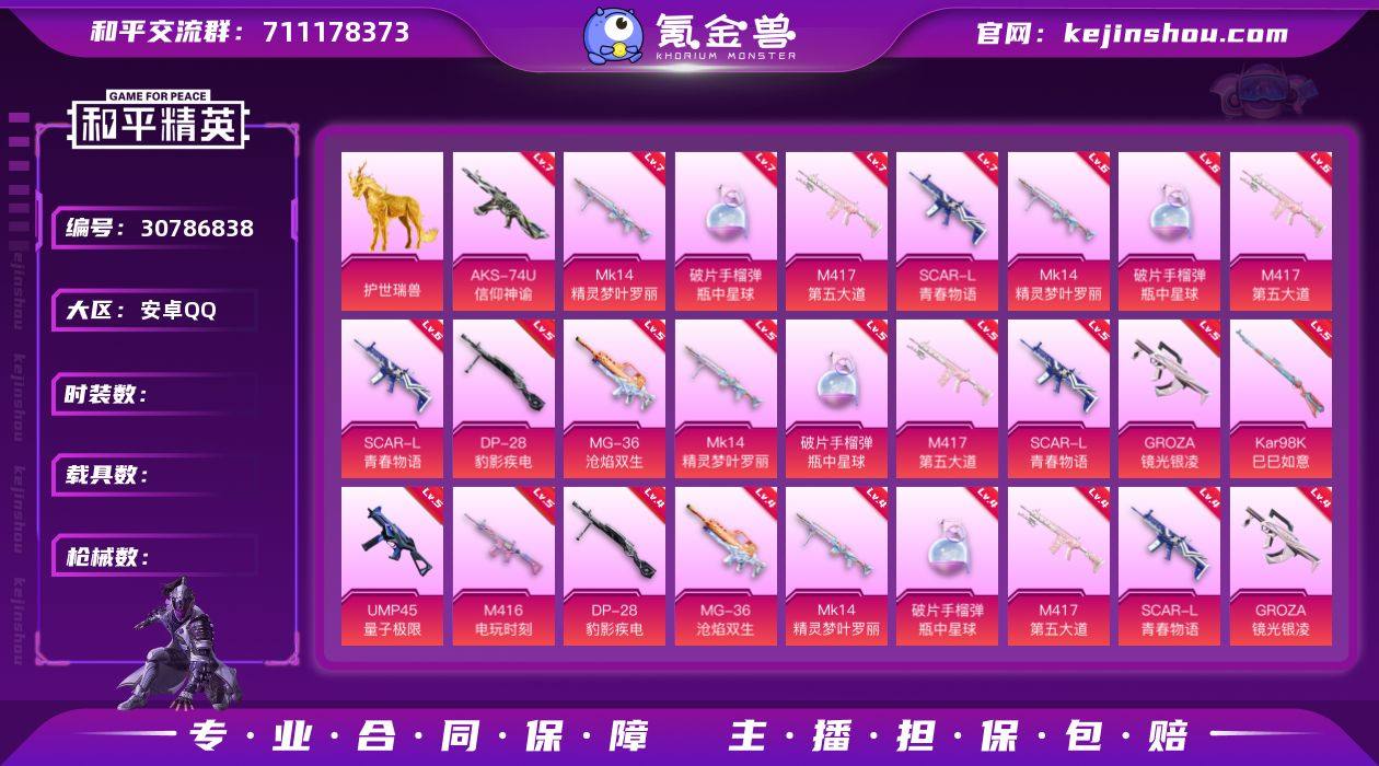 【H49】安卓 手Q-9粉装-9特效枪-2载具-53867热力值-0印记-104套装-140枪皮 【稀有载具】:兰博基尼URUS(明艳黄),特斯拉Roadster(水滴蓝) 【特效枪等级】:AKM-炫紫旋律(四级AKM-炫紫旋律),SCAR-L-机甲封神(四级SCAR-L-机甲封神),M416-五爪金龙(六级M416-五爪金龙),M762-冷魅冰骑(五级M762-冷魅冰骑),M762-激战未来(一级M762-激战未来),UZI-绮梦青鸾(四级UZI-绮梦青鸾),UMP45-相思残雪(五级UMP45-相思残雪),Kar98K-巳巳如意(三级Kar98K-巳巳如意),SLR-暗夜玫瑰(二级SLR-暗夜玫瑰) 【优质套装】:角色-零号机款机体服,粉装-梦幻火箭,粉装-粉色回忆,粉装-扶摇飞仙,角色-洛天依,粉装-紫电风暴,粉装-赤焰黑爵 【稀有套装】:粉装-冷魅冰骑,粉装-甜梦冰蝶 【优质武器皮肤】:AKM-炫紫旋律,SCAR-L-机甲封神,M416-五爪金龙,M762-激战未来,M762-冷魅冰骑,UZI-绮梦青鸾,UMP45-相思残雪,Kar98K-巳巳如意,SLR-暗夜玫瑰 【稀有武器皮肤】:AKM-夜灯,AKM-彩虹符号,AKM-灼热熔岩,AKM-王牌投手,AKM-萌趣颜团子,AKM-虎虎生威,M16A4-幻世战舞者,M16A4-甜心亚梦,SCAR-L-玉兔迎春,M416-糯团青竹,M416-紫翼圣骑,M416-红色方程式,GROZA-异彩先驱,GROZA-彩虹符号,GROZA-恐龙拽拽,GROZA-懵萌河马,GROZA-治愈之星,AUG-天降萌叽,AUG-青春冒险家,QBZ-彩虹符号,QBZ-飞驰魅影,M762-天降萌叽,M762-瑞龙福将,Mk47-天之羽翼,Mk47-妙红点点,Mk47-粉色回忆,Mk47-青春冒险家,G36C-冷魅冰骑,G36C-懵萌河马,G36C-时空追击者,G36C-暗夜玫瑰,AC-VAL-天降萌叽,AC-VAL-甜心亚梦,蜜獾-天降萌叽,UZI-影袭,UZI-炫彩节奏,UMP45-时空追击者,UMP45-春暖花开,UMP45-海渊国主,UMP45-生命誓言,Vector-PEL轰鸣竞梦者,Vector-枪炮玫瑰,Vector-治愈之星,汤姆逊-古战神甲,汤姆逊-异彩先驱,野牛...
