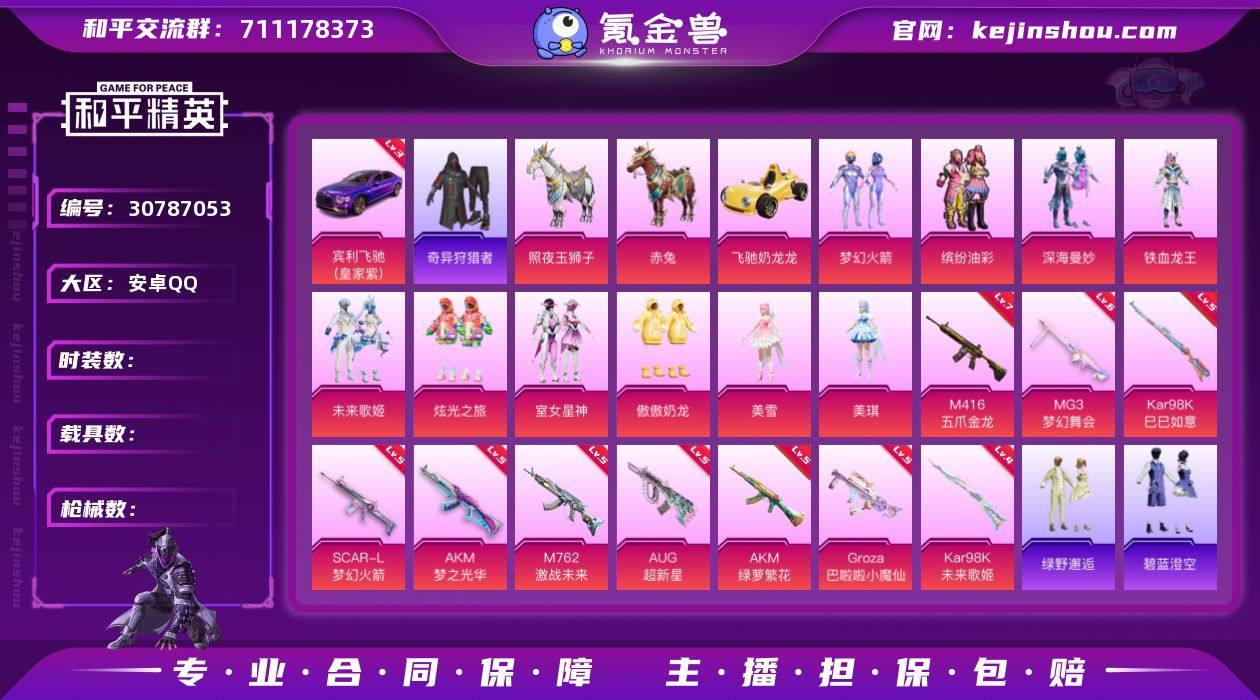 和平王者一体号 安卓 手Q-7粉装-7特效枪-1载具-3粉色飞行器-77813热力值-20王牌印记-204套装-234枪皮LK262321 【热门品类】:粉装-雪国幻梦,粉装-梦幻火箭,套装-浪漫天命,套装-深海小丑鱼,套装-小丑鱼,套装-动感兔斯基人偶服,套装-龟仙人,套装-暗影哥特 【粉色套装】:粉装-雪国幻梦,粉装-梦幻火箭,粉装-星之彼岸,粉装-齐天大圣,角色-初号机款机体服,粉装-筑梦精灵,粉装-仲夏莫吉托 【粉色枪皮等级】:AKM-梦之光华(六级),SCAR-L-青春物语(七级),M416-五爪金龙(六级),Kar98K-未来歌姬(二级),Kar98K-巳巳如意(五级),VSS-烈焰拳霸(三级),DP-28-豹影疾电(五级) 【粉色载具】:兰博基尼Estoque(银翼灰) 【粉色枪皮】:AKM-梦之光华,SCAR-L-青春物语,M416-五爪金龙,Kar98K-未来歌姬,Kar98K-巳巳如意,VSS-烈焰拳霸,DP-28-豹影疾电 【粉色飞行器】:青春物语飞行器,璀璨巨星飞行器,龙翔九天飞行器 【粉色降落伞】:未来战士降落伞,梦幻火箭降落伞,四圣焕新降落伞,星之彼岸降落伞,暗夜玫瑰降落伞,绚金瑰梦降落伞,庄周梦蝶降落伞,筑梦精灵降落伞,垂柳戏鸭降落伞,第五大道降落伞,天星战神降落伞,未来歌姬降落伞,精灵梦叶罗丽降落伞,鬼刀降落伞,炫彩糖果降落伞 【稀有套装】:套装-龟仙人,套装-巳巳如意,套装-雪国风尚,角色-多纳泰罗 【稀有枪皮】:AKM-彩虹符号,AKM-影袭,AKM-星之信仰,AKM-灼热熔岩,AKM-环太平洋,AKM-生命誓言,AKM-破晓战魂,AKM-缤纷海域,AKM-萌趣颜团子,AKM-虎虎生威,AKM-霓虹街区,AKM-龙的传人,M16A4-幻世战舞者,M16A4-快乐主宰,M16A4-甜心亚梦,M16A4-红色方程式,M16A4-蓝色火焰,SCAR-L-夜灯,SCAR-L-炫彩节奏,SCAR-L-玉兔迎春,SCAR-L-生命誓言,SCAR-L-红色方程式,SCAR-L-黄金龙骨,M416-夜灯,M416-糯团青竹,M416-紫翼圣骑,M416-...