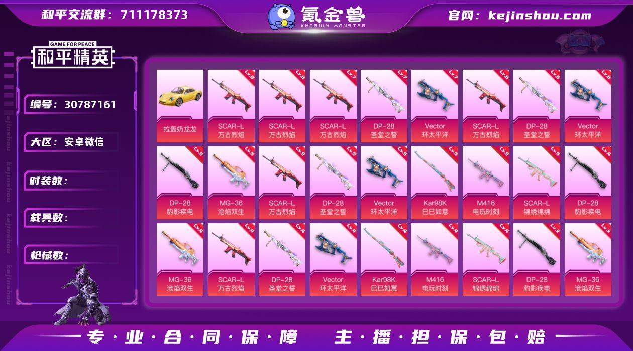 安卓 手Q-1神装-8粉装-16特效枪-1载具-10粉色飞行器-83812热力值-13王牌印记-152套装-246枪皮 【红色神装等级】:最终圣卫者-帕修斯(二级) 【红色角色神装】:最终圣卫者-帕修斯 【热门品类】:套装-深海小丑鱼,套装-龟仙人,角色-Mark.06 【粉色载具】:最终圣卫者摩托车 【粉色套装】:角色-洛天依,粉装-闲梦青缨,角色-烟云彩露,角色-千金淑猫,角色-萨利娅,粉装-星穹咏叹调,角色-荧海星豚 【粉色枪皮等级】:AKM-绿萝繁花(五级),SCAR-L-锦绣绵绵(五级),M416-电玩时刻(五级),GROZA-镜光银凌(五级),AUG-暖羊咩咩(五级),M762-青锋波束(五级),UMP45-量子极限(五级),Vector-最终圣卫者(三级),汤姆逊-热量炸弹(五级),Kar98K-巳巳如意(五级),Mk14-甜梦熊击(五级),AMR-智耀战神(七级),DP-28-千金淑猫(七级),DP-28-豹影疾电(五级),PKM-江南烟雨(七级),破片手榴弹-美味星星糖(六级) 【粉色枪皮】:AKM-绿萝繁花,SCAR-L-锦绣绵绵,M416-电玩时刻,GROZA-镜光银凌,AUG-暖羊咩咩,M762-青锋波束,UMP45-量子极限,Vector-最终圣卫者,汤姆逊-热量炸弹,Kar98K-巳巳如意,Mk14-甜梦熊击,AMR-智耀战神,DP-28-千金淑猫,DP-28-豹影疾电,PKM-江南烟雨,破片手榴弹-美味星星糖 【粉色飞行器】:黄族统领飞行器,萌物绒绒飞行器,镜域双华-灵镜之阶,英伦信使飞行器,BEARBRICK飞行器,曦光华影飞行器,时光之誓飞行器,终晖之翼飞行器,智趣喵喵飞行器 【粉色降落伞】:梦幻火箭降落伞,洛神天依降落伞,垂柳戏鸭降落伞,黄族统领降落伞,天星战神降落伞,莲影清波降落伞,圣堂之誓降落伞,蜜语绒猫降落伞,镜域双华降落伞,江南烟雨降落伞,精灵梦叶罗丽降落伞,创世·救赎降落伞,守护天翼降落伞,宇宙意志降落伞,未来领航者降落伞,千金淑猫降落伞,绯果甜心降落伞,星穹咏叹调降落伞,时光之吻降落...