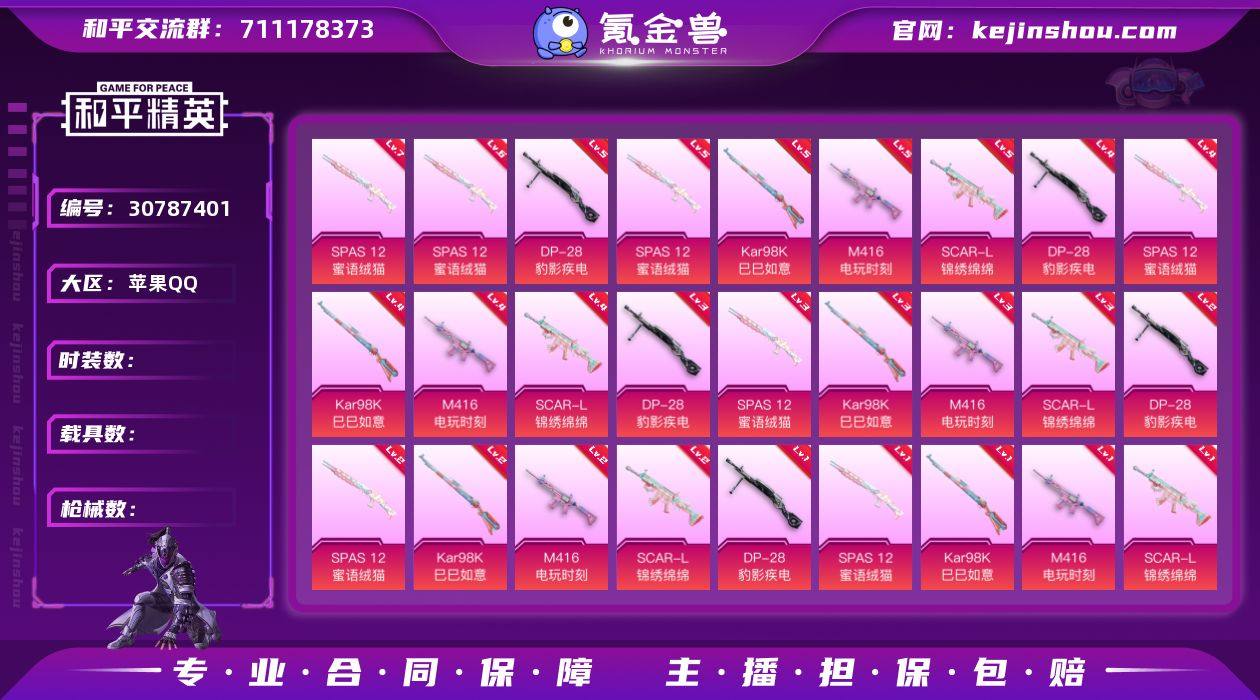 J1193 精品无敌战神 15粉 7特 1载具 双字ID 都市猎人 胖达团团 小丑鱼 暗影哥特 浪漫天命 缤纷油彩 异瞳灵姬 幻影战神 天使彩虹糖 满级scar火箭少女 苹果 手Q-无敌战神框-15粉装-7特效枪-1载具-3粉色飞行器-95873热力值-17王牌印记-235套装-269枪皮 【热门品类】:粉装-缤纷油彩,套装-浪漫天命,套装-都市猎人,套装-小丑鱼,套装-胖达团团,套装-胖达圆圆,套装-动感兔斯基人偶服,套装-龟仙人,套装-潮萌小黄鸭,套装-暗影哥特,套装-浪漫波比 【粉色套装】:粉装-幻影战神,粉装-天使彩虹糖,粉装-缤纷油彩,粉装-极致幻想,粉装-锦绣火鲤,粉装-迷蝶贵族,粉装-星之彼岸,粉装-馨动时刻,粉装-炙焰赤龙,粉装-彩虹鹿灵,粉装-蓝莓炮弹,粉装-赤焰黑爵,粉装-紫电风暴,粉装-暗夜鎏金,角色-异瞳寒姬 【粉色枪皮等级】:SCAR-L-梦幻火箭(七级),M762-甜蜜誓约(七级),Vector-飒粉甜心(七级),Kar98K-巳巳如意(五级),SPAS-12-音爆索尼克(七级),DP-28-豹影疾电(五级),MG-36-沧焰双生(五级) 【粉色载具】:星河领航(磐石银) 【粉色枪皮】:SCAR-L-梦幻火箭,M762-甜蜜誓约,Vector-飒粉甜心,Kar98K-巳巳如意,SPAS-12-音爆索尼克,DP-28-豹影疾电,MG-36-沧焰双生 【粉色飞行器】:梦幻火箭飞行器,沙丘之主天马,镜域双华-灵镜之阶 【粉色降落伞】:深海曼妙降落伞,粉色回忆降落伞,梦幻火箭降落伞,炫紫旋律降落伞,甜蜜誓约降落伞,潮汐统领降落伞,阿狸红降落伞,夏日绵绵冰降落伞,星之彼岸降落伞,蓝莓炮弹降落伞,橘柚倾心降落伞,筑梦精灵降落伞,环太平洋降落伞,暗夜鎏金降落伞,第五大道降落伞,黄族统领降落伞,镜域双华降落伞,墨龙九天降落伞,魔法神域降落伞,忍者神龟降落伞,临安公主降落伞,月影灵韵降落伞,喜羊羊与灰太狼降落伞,异瞳寒姬降落伞 【稀有套装】:套装-龟仙人,套装-...