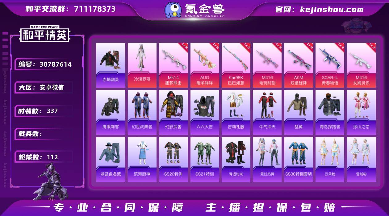 YM9489身法素材/1粉7特/M416女娲灵识/赤蝎/地铁满天赋/Ak旋律/实名: 可修改 时装数: 337 枪械数: 112 战备数: 74 热门装扮: 鹰眼刺客,赤蝎幽灵,冷漠罗丽 稀有枪皮: AKM炫紫旋律,SCAR-L青春物语,M416电玩时刻,Kar98K-巳巳如意,M416-女娲灵识,AUG-暖羊咩咩,MK14-甜梦熊击