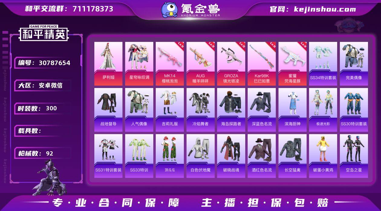 YM9531-2粉5特/地铁38天赋/满级AUG暖羊/狗砸镜光满级/MK14樱桃泡泡/蜜罐-萤海星豚/小丑鱼/懒羊羊/摩登魅猫/蜜桃派队/实名: 可修改 时装数: 300 枪械数: 92 战备数: 60 热门装扮: 萨利娅,星穹咏叹调 稀有枪皮: GROZA-镜光银凌,Kar98K-巳巳如意,AUG-暖羊咩咩,MK14-樱桃泡泡,蜜獾-荧海星豚