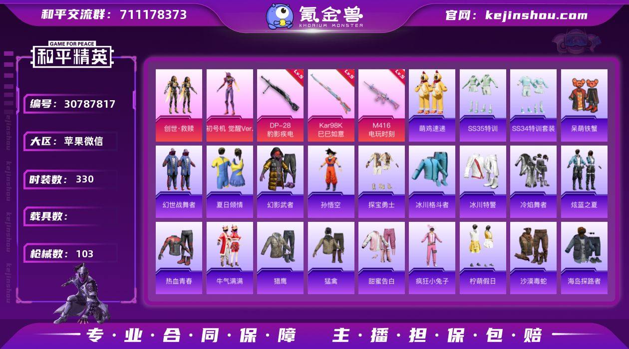 YM7990短笛/孙悟空/三色螳螂/哥特眼罩/情公主/地铁42天赋实名: 可修改 时装数: 330 枪械数: 103 战备数: 68 热门装扮: 呆萌铁蟹,创世·救赎,初号机 觉醒Ver. 稀有枪皮: M416电玩时刻,Kar98K-巳巳如意,DP-28-豹影疾电