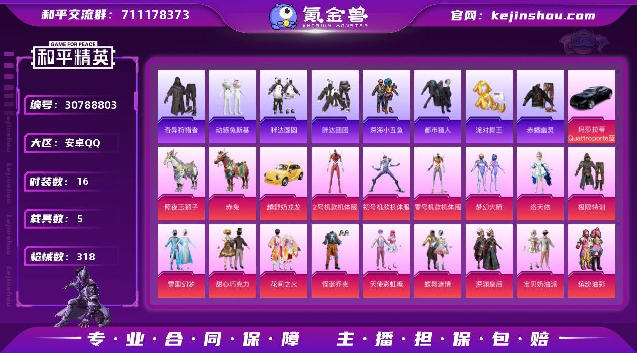 安卓手Q-16王牌印记-有战神框-54粉装-16特效枪-5载具-热力值-282套装-318枪皮-2卓越印记-2传奇印记 【54粉装】,雪国幻梦,梦幻火箭,零号机款机体服,初号机款机体服,2号机款机体服,甜心巧克力,宝贝奶油派,天使彩虹糖,小叽联名款,缤纷油彩,放客神游,新星烈龙,灵感创作师,童趣迷兔,蝶舞迷情,洛天依,怪诞乔克,白勺歌姬,彩虹甜喵,花间之火,严莉莉,粉樱探戈,深渊皇后,镜光幻境,蓝莓炮弹,碧影闪光,复仇流浪者,冰炎战车,紫钛骑兵,小可学妹,蜜语绒猫,美雪,傲雪凌霜,霁雪冰心,寒光使者,莲影清波,甜梦小狐,馨动时刻,冰川粉黛,冰川幽秘,冰川红玫,旋转彩虹,冰霜白皇,炙焰红王,极限特训,山涧鹿灵,青葱仙萝,蜜桃特工,蝶舞蔷薇,未来战士,星之彼岸,呆萌星弥,小蓝,美琪 【16特效枪】AKM-熔岩统帅-3级 AKM-星际浪客-4级 SCAR-L-童趣迷兔-4级 M416-心之恋语-4级 M416-五爪金龙-6级 GROZA-旋转彩虹-4级 AUG-星之彼岸-4级 Kar98K-巳巳如意-5级 Kar98K-创世·救赎-1级 M24-莲影清波-1级 M24-镜域双华-1级 AWM-天使羽翼-1级 UMP45-相思残雪-7级 汤姆逊-怪笑疯兔-2级 P90-粉樱探戈-4级 平底锅-林间仙鹿-2级 【21稀有紫装】,都市猎人,派对舞王,赤蝎幽灵,萌熊伴侣背包(3级),奇异狩猎者,暗影哥特,深海小丑鱼,浪漫天命,胖达圆圆,浪漫波比,迅捷狂鲨,胖达团团,明日香款战斗服,龟仙人,暗夜魅影,六号树人,萌熊伴侣背包(2级),零款战斗服,真理款战斗服,真嗣款战斗服,东方飞龙, 【1红装】,镜域双华-欧若拉/1级, 【5稀有载具】,迈凯伦570S(炫冰蓝)/5级,玛莎拉蒂Quattroporte(夜幕蓝),越野奶龙龙,赤兔,照夜玉狮子, 【1僚机】,僚机-萌兔起飞, 【283稀有时装】,天网终结者,2B战斗服款,欧若拉/1级,恋语绒绒,都市猎人,胖达团团,浪漫天命,暗夜魅影,奇异狩猎者,龟仙人,暗影哥特,深海小丑鱼,东方飞龙,迅捷狂鲨,零款战斗服,明日香款战斗